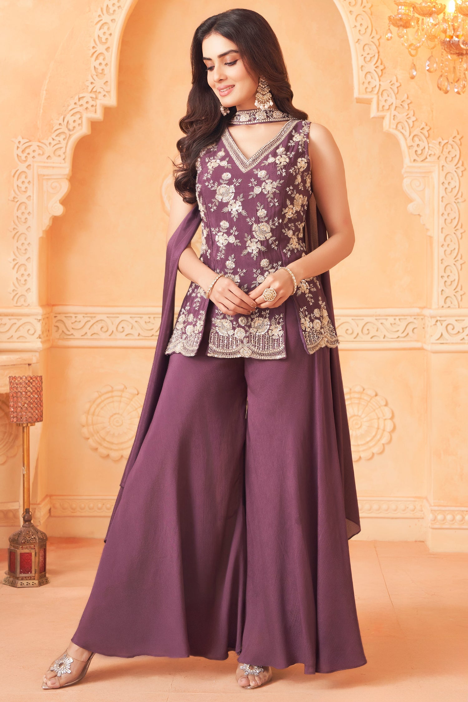 The color of this ensemble is a bold Antique Fuchsia Purple, a high-energy jewel tone that exudes confidence and luxury through the rich texture of Chinon silk. Step into the spotlight with this Floral Palazzo Set, a masterpiece designed for the modern woman who loves a high-contrast, regal aesthetic.The tunic is hand-adorned with multi-colored floral vines, where every flower is meticulously detailed with shimmering sequins and glass beads. The vibrant fuchsia base makes the silver and pastel embroidery pop brilliantly. Paired with ultra-wide Chinon palazzos and a matching dupatta, this set is a definitive statement for evening receptions and high-fashion galas.