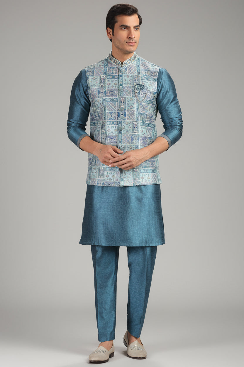 Capture the refreshing spirit of the tropics with this Aqua Blue Silk Kurta Pajama set, an ensemble that perfectly balances modern vibrance with traditional poise. The set features a suave aqua blue silk kurta and matching pants, providing a cool and cohesive monochromatic base. The look is masterfully elevated by a coordinated printed jacket, adding a layer of artistic flair and contemporary definition to the silhouette. Crafted from premium silk for a rich feel and a gentle celebratory sheen, this 3-piece set is an ideal choice for beach weddings, summer festivities, and lively daytime ceremonies like Haldis and Mehendis.