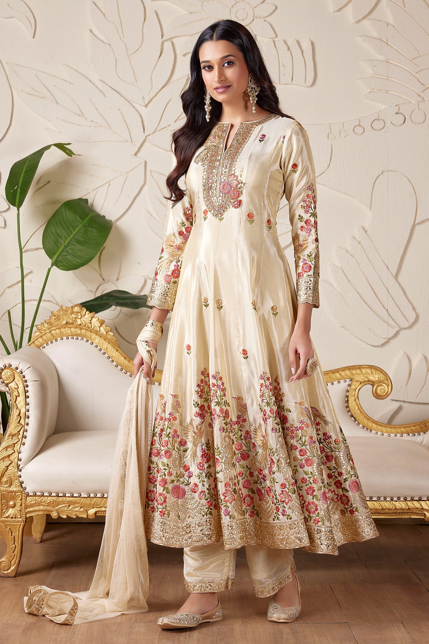 A soft beige tissue Anarkali suit that exudes delicate festive charm. The flowing silhouette is adorned with intricate floral embroidery and charming bird motifs, enhanced with subtle gota work for a refined shimmer. Light and graceful, this ensemble combines traditional detailing with elegant movement, making it perfect for festive occasions and celebratory gatherings.