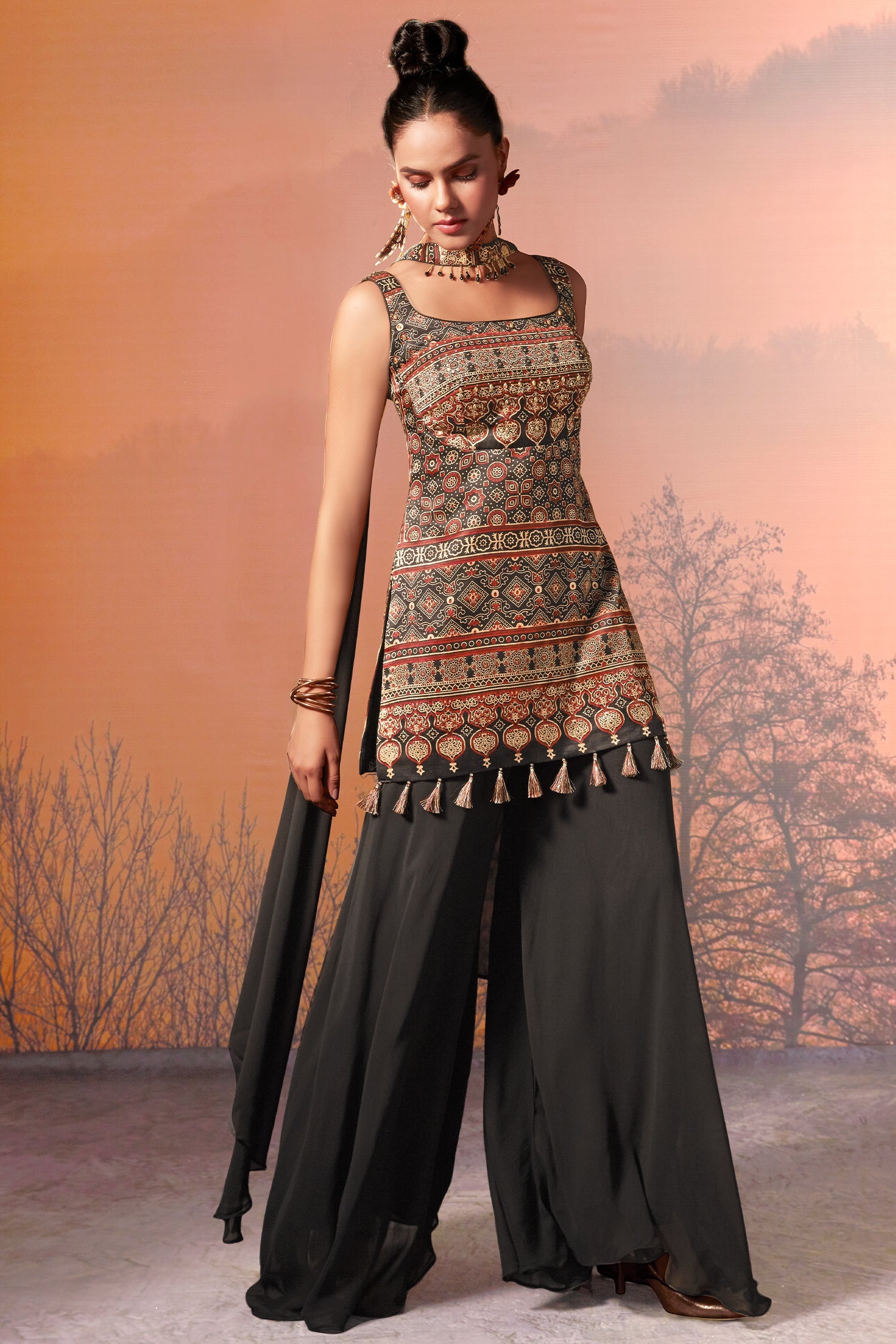 Redefine ethnic elegance with this Modal Silk Palazzo Suit, a masterclass in combining ancient printing techniques with modern-day structural flair. The outfit features voluminous wide-leg palazzos crafted from fluid black georgette, offering a lightweight drape and a regal silhouette that ensures graceful movement with every step.The centerpiece of the ensemble is the expertly tailored straight-cut tunic, featuring a chic square neckline and delicate straps. The tunic is adorned with a spectacular authentic Ajrakh print, showcasing rhythmic geometric and floral patterns in traditional madder red and indigo tones. The printed design is meticulously enhanced with hand-placed shimmering sequins, adding a subtle, light-catching sparkle to the heritage motifs. A standout detail is the hemline, which is finished with a row of delicate silk tassels, adding a playful and rhythmic touch to the structured top. To complete the look, a matching sheer black dupatta is included, cascading elegantly from the shoulder. Perfectly suited for festive dinners, evening soirées, or cultural celebrations, this set is a definitive statement of curated luxury.