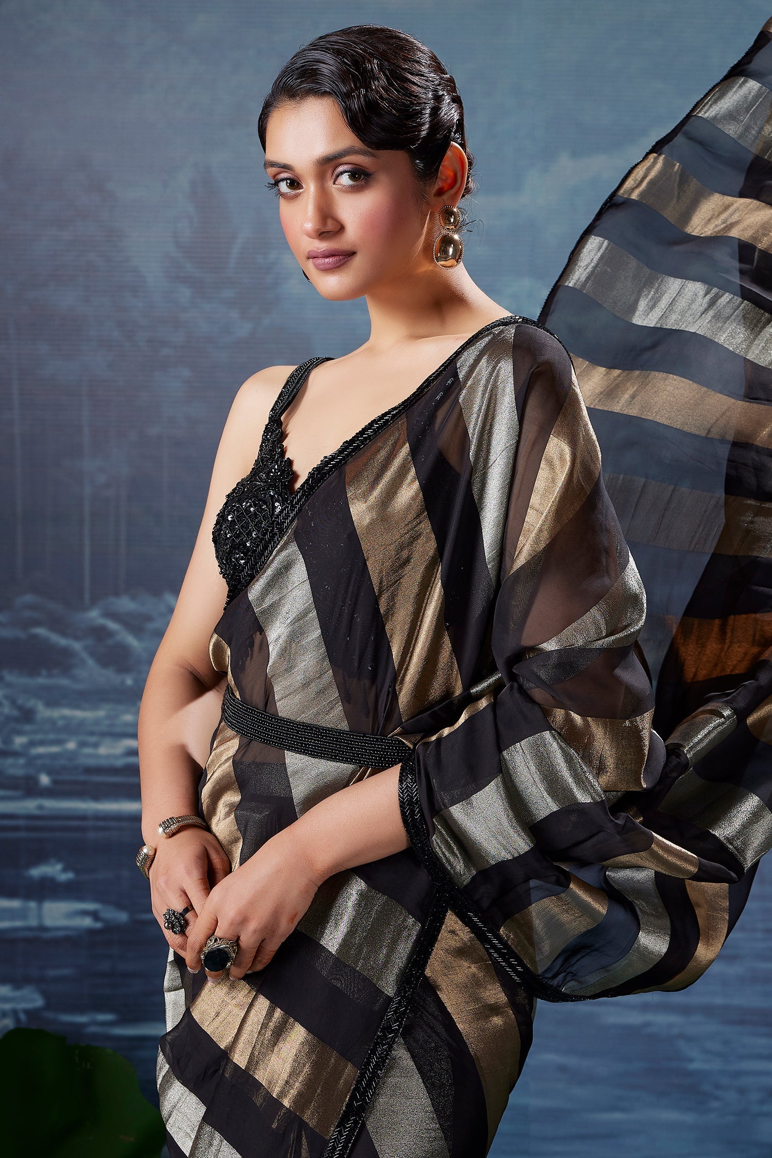 Make a high-fashion statement in this black crepe silk pre-draped saree, featuring a fluid, and striped pattern effortless silhouette that offers a contemporary twist on a timeless classic. The ensemble is paired with a masterfully tailored halter-neck blouse, lavishly drenched in multi-colored sequins and intricate floral embroidery. Designed for grand entrances, the sleek drape is elevated by a rich, textured bodice that catches the light beautifully from every angle. This design strikes a flawless balance between avant-garde styling and traditional artisanal charm, making it an ideal choice for glamorous evening soirées.