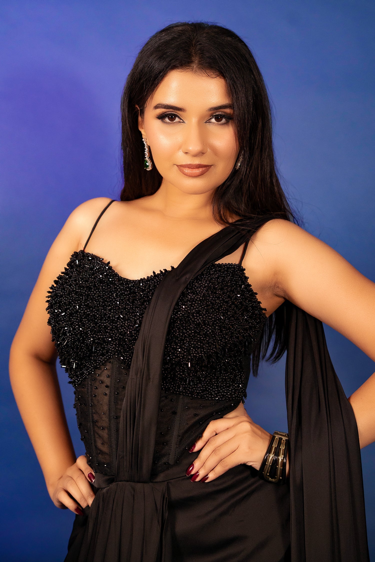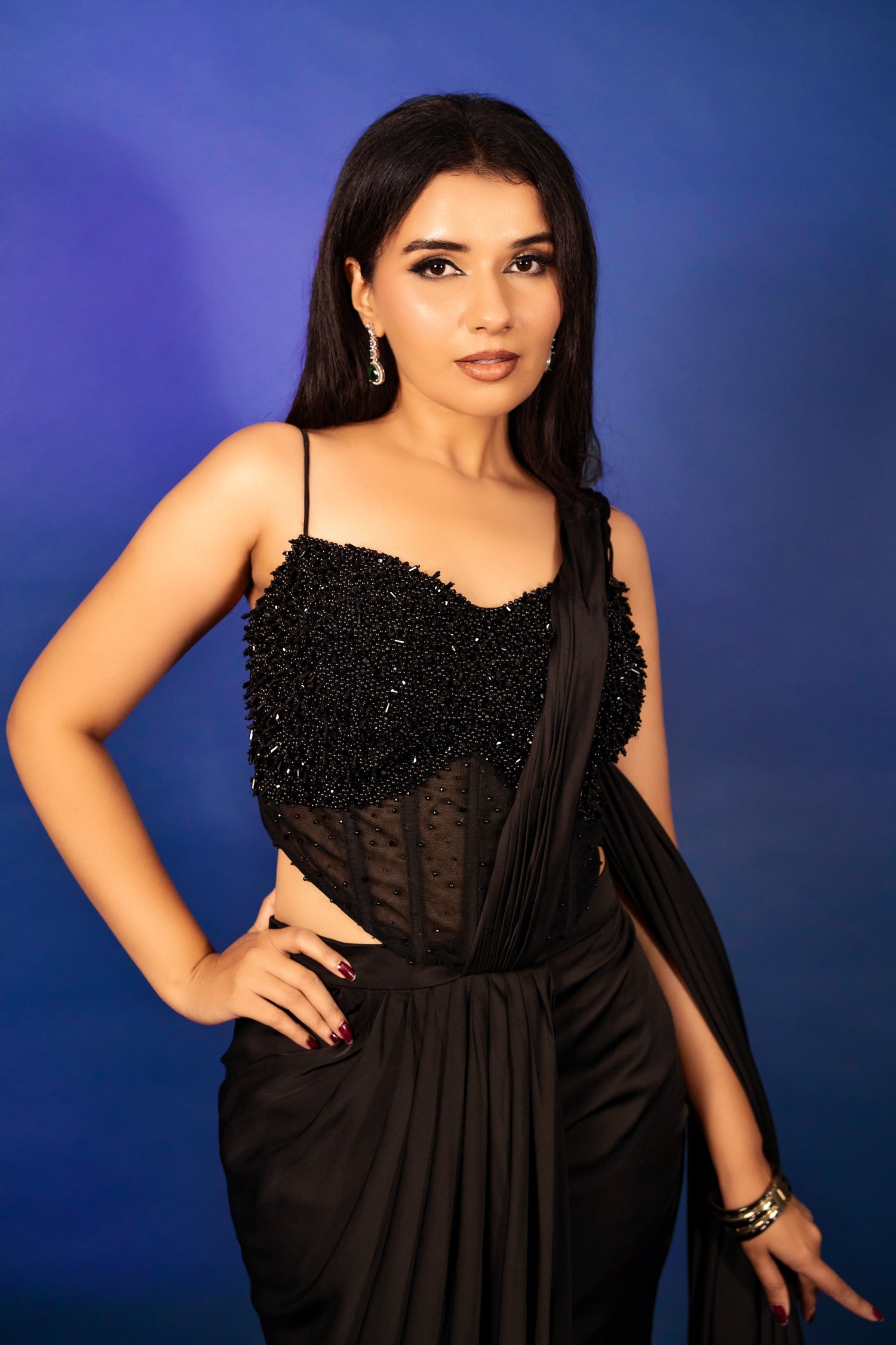 This contemporary draped ensemble features a sleek satin silhouette paired with a fluid palazzo-style drape for effortless elegance. The highlight is a structured corset blouse, densely hand-embellished with pearls, beads, and tonal accents that add rich texture and depth. A sheer net panel detailing lends a modern edge while enhancing the sculpted fit. Finished with a clean, minimal drape that falls gracefully, allowing the craftsmanship to stand out. Perfect for cocktail evenings, receptions, and high-fashion festive occasions.