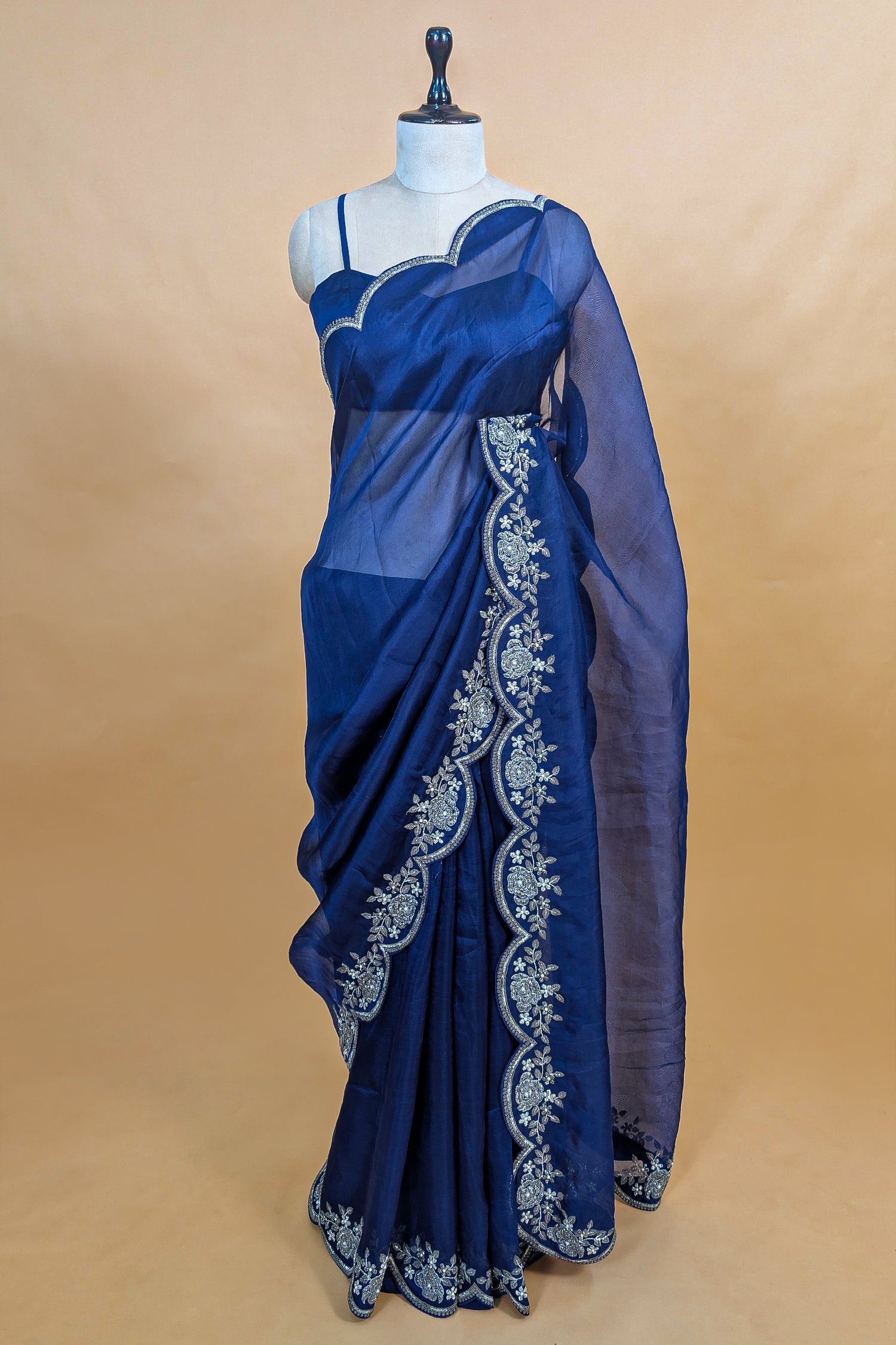 This Midnight Blue Organza saree defines modern cinematic glamour, featuring a crisp, voluminous drape that embodies effortless luxury. The solid-toned body is framed by a dramatic scalloped border, meticulously hand-embroidery with intricate Zardosi, shimmering beads, and precision cutdana work. The ensemble is uniquely paired with a contemporary three-piece blouse set, including a sleek sweetheart-neck crop top and a structured matching jacket adorned with coordinated metallic handwork on the lapels and cuffs. This high-fashion silhouette is perfect for the trendsetting woman looking to make a powerful statement at evening receptions or cocktail galas.