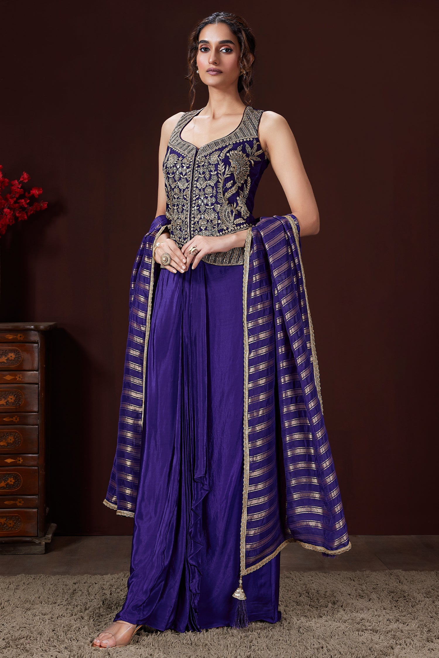 Redefining contemporary ethnic wear, this violet raw silk ensemble features a sleek sleeveless embroidered top with a refined curved hemline. The bodice is richly adorned with intricate gold floral threadwork, mirror accents, and cutdana detailing, creating a striking contrast against the deep-toned base. Paired with fluid pleated palazzo-style bottoms, the silhouette offers effortless movement with a polished finish. Ideal for luxury evening events and festive soirées, this design balances traditional artistry with bold, modern tailoring.