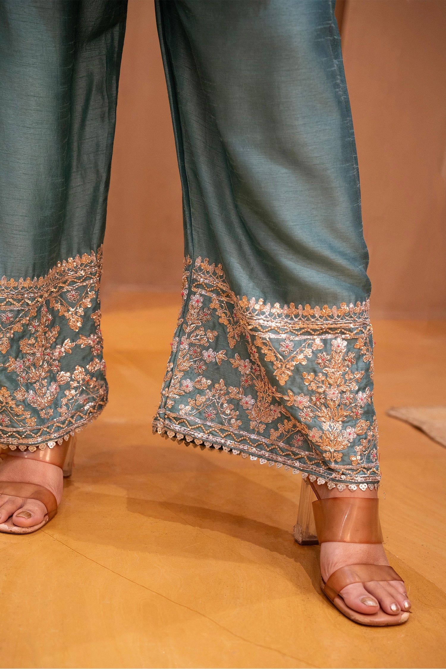 This refined blue silk co-ord set features intricate zardosi and sequin embroidery forming elegant motifs along the kurta and sleeve panels. The straight-cut silhouette is balanced with a beautifully coordinated bottom highlighted by detailed embroidered hems. Crafted in rich silk with a soft sheen, it offers a polished yet effortless look. A versatile ensemble suited for festive gatherings, intimate celebrations, and graceful day-to-evening wear.