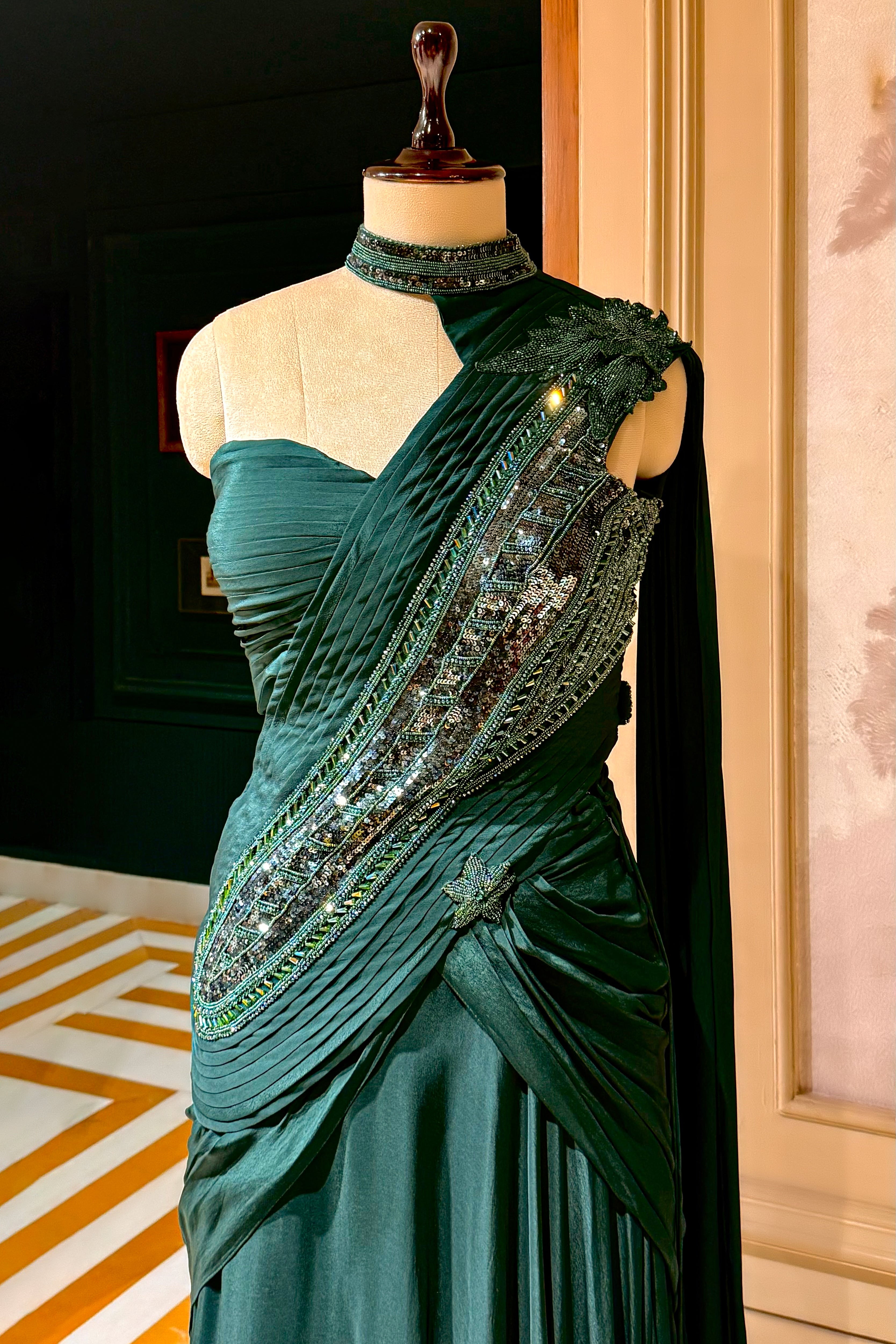 A: This is an Indowestern Gown silhouette that incorporates a fixed saree-style drape, giving you the elegance of a saree with the modern ease of a gown.