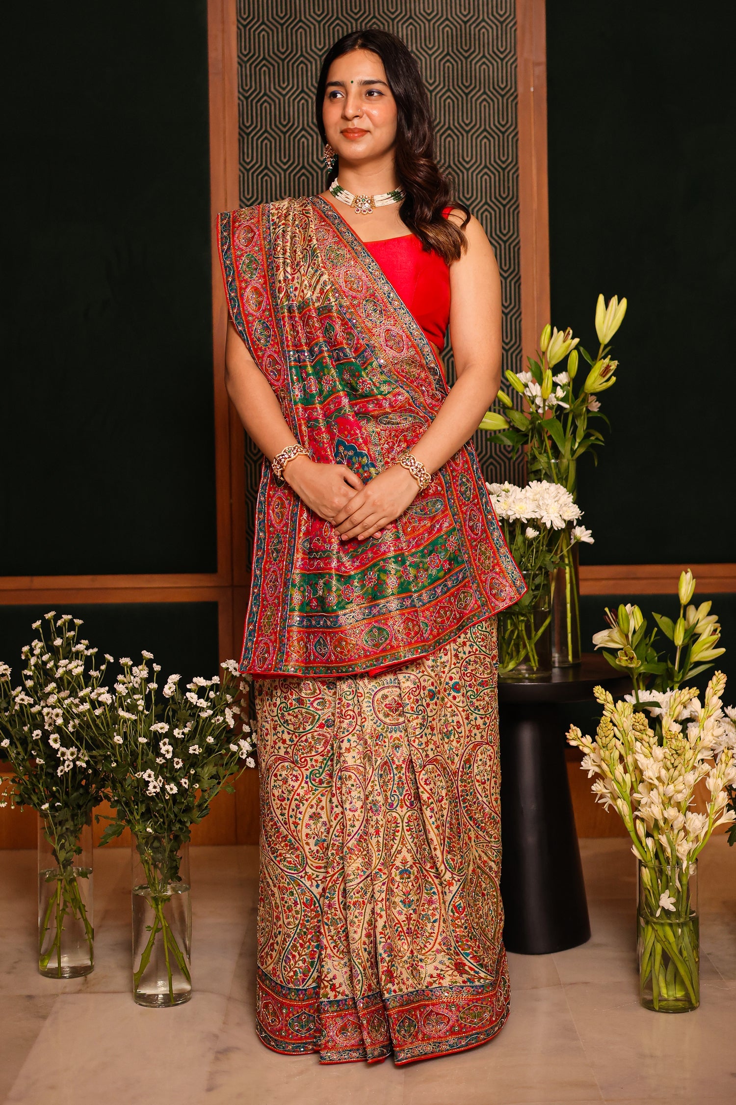 Wrap yourself in artistic elegance with this cream dola silk saree, adorned with vibrant multi-colored pashmina-style prints that bring a rich, timeless charm. The luxurious fabric flows beautifully, while the delicate cutdana highlights add a subtle shimmer to elevate your festive look. Its intricate detailing and traditional patterns make it perfect for cultural celebrations, weddings, and grand gatherings. A statement drape that beautifully blends craft, color, and sophistication in every inch.