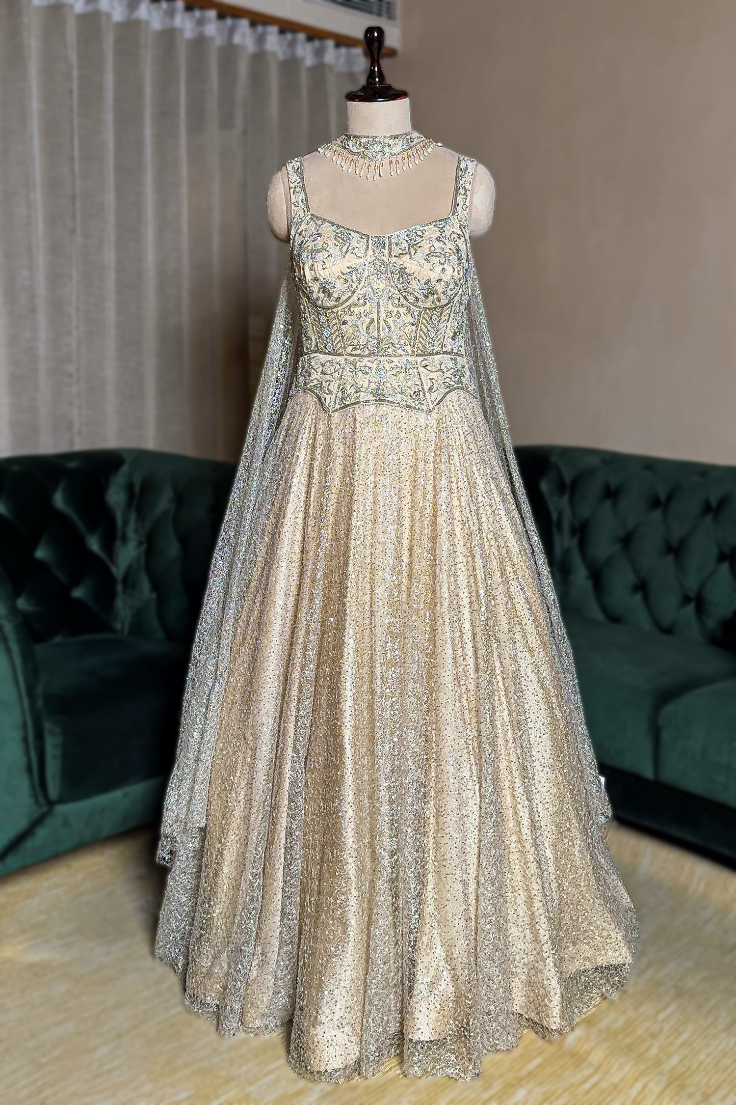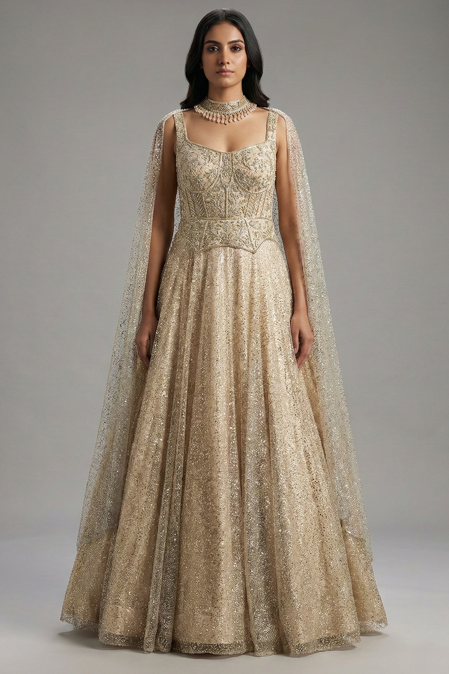 Luminous and regal, this Cream Net Designer Sequinned Gown is a masterpiece of modern evening wear, designed for the woman who commands attention at every gala and reception. The silhouette is defined by a meticulously structured bodice that serves as a canvas for a lavish display of Zardosi embroidery, shimmering diamonds, and hand-strung pearls. This artisanal detail transitions into a voluminous net skirt, drenched in a stardust-like scatter of multi-toned sequins and beads that shimmer with every step. Complete with a matching net choker dupatta adorned with delicate hanging pearl droplets, this ensemble offers a sophisticated, jewelry-integrated look that epitomizes red-carpet luxury.