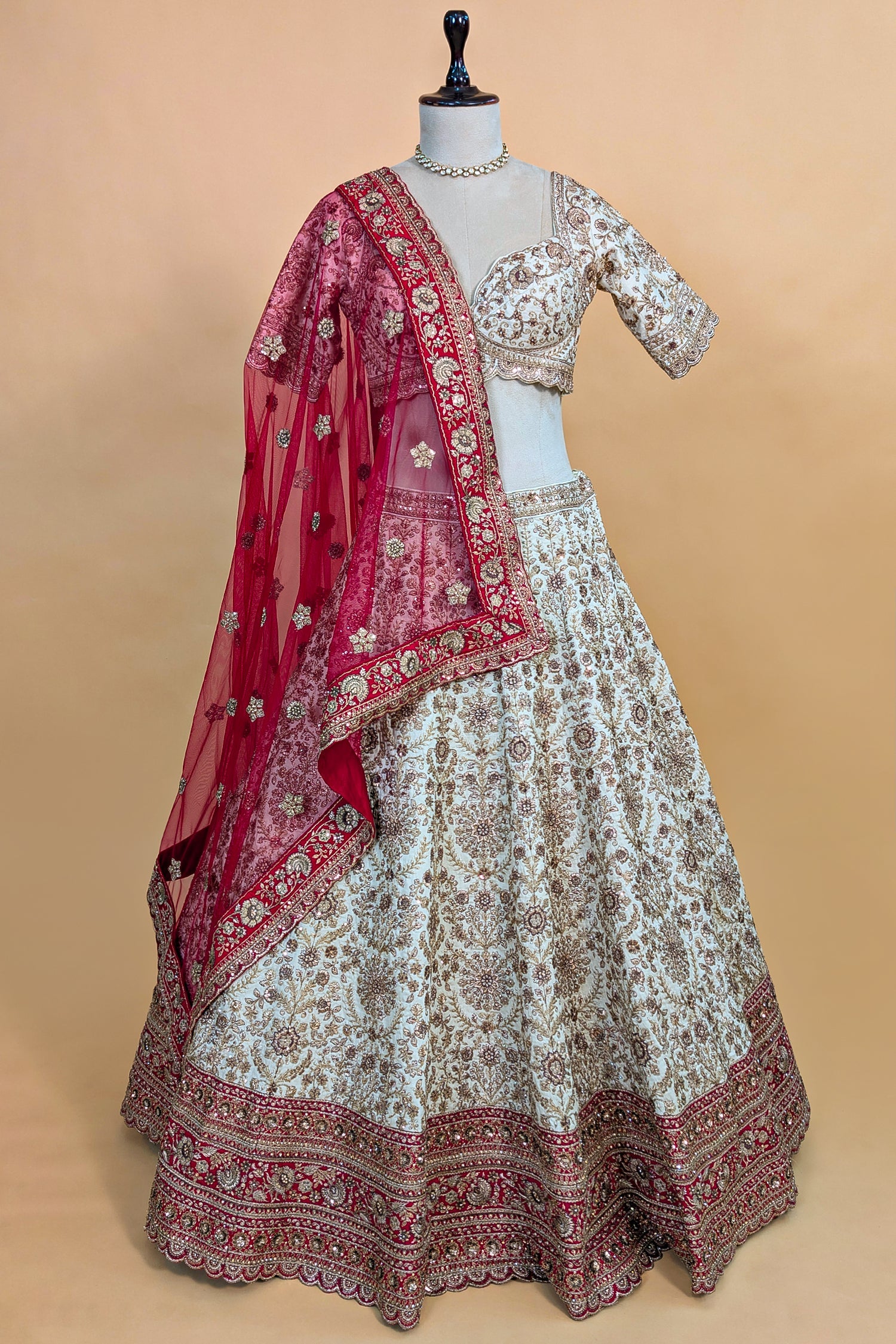 Exude timeless regal elegance with this exquisite Cream Raw Silk Lehenga. The voluminous skirt is a masterpiece of craftsmanship, heavily adorned with intricate **Zardosi, Bead, and Sequin work** in floral motifs that shimmer with a vintage gold allure. The ensemble is perfectly contrasted by a rich **Red Net Dupatta** featuring a heavy, embroidered border, adding a traditional bridal touch. This majestic outfit is designed for the bride who wants to blend classic sophistication with royal grandeur.