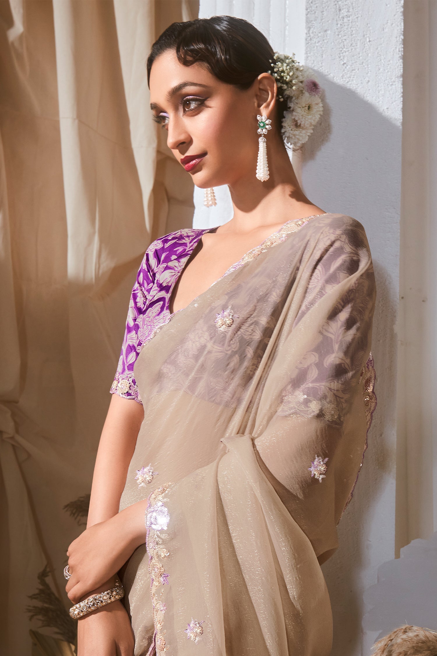 The cream saree exudes ethereal grace, woven from a delicate blend of organza and tissue that imparts a subtle sheen and airy elegance. Intricately embroidered floral motifs, highlighted with fine lace detailing, trace the drape and borders, creating a look of timeless sophistication. The ensemble is beautifully complemented by a rich purple blouse, adorned with elaborate embroidery that adds a regal contrast to the soft cream hue. Perfect for festive soirées and elegant celebrations, this saree captures the essence of refined charm and effortless luxury.