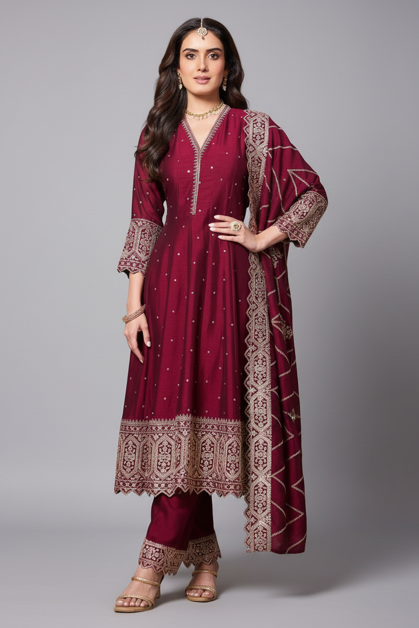 This dark maroon art silk Anarkali suit exudes classic luxury, highlighted by shimmering sequin embroidery throughout. Its rich tone and flowing flare create a stunning festive presence. Completed with a matching dupatta, it offers a refined and elegant ensemble ideal for weddings and grand celebrations.