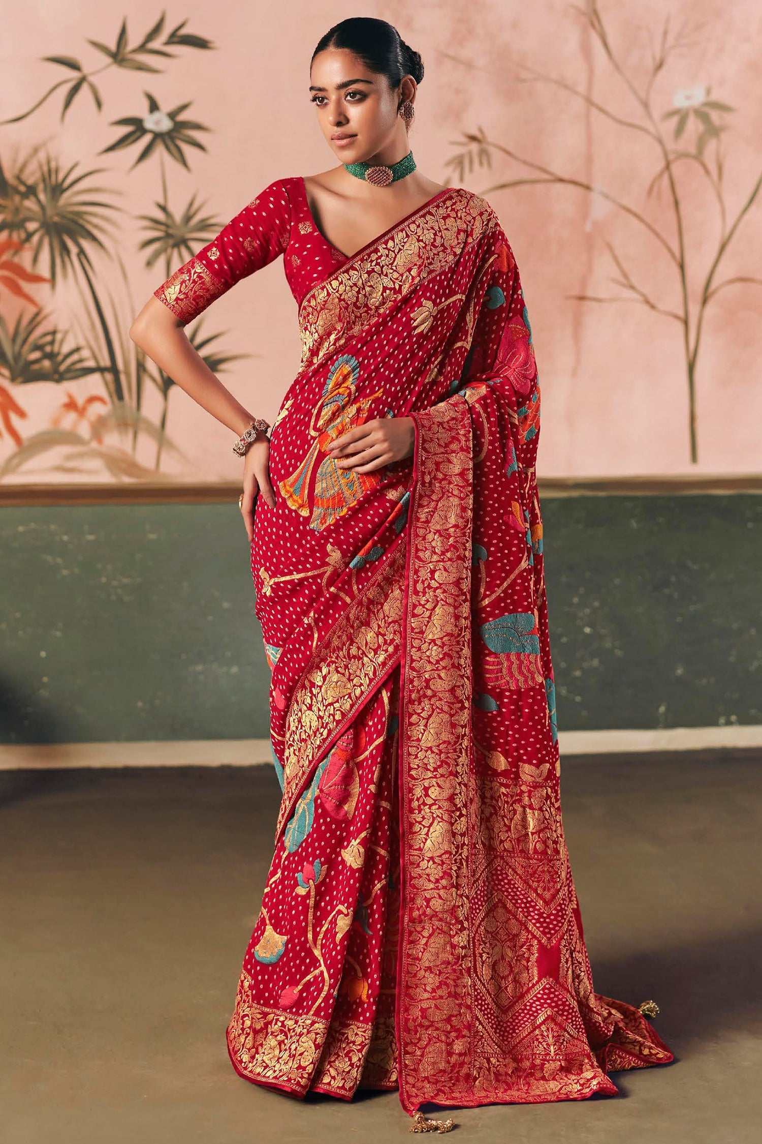 This stunning dark red georgette saree features traditional Bandhej weaving, showcasing exquisite craftsmanship. Crafted from lightweight georgette fabric, it drapes gracefully, creating a soft and elegant silhouette. The deep red hue adds richness and a bold, festive appeal. Perfect for weddings, celebrations, and cultural events, this saree beautifully blends timeless tradition with sophisticated style.