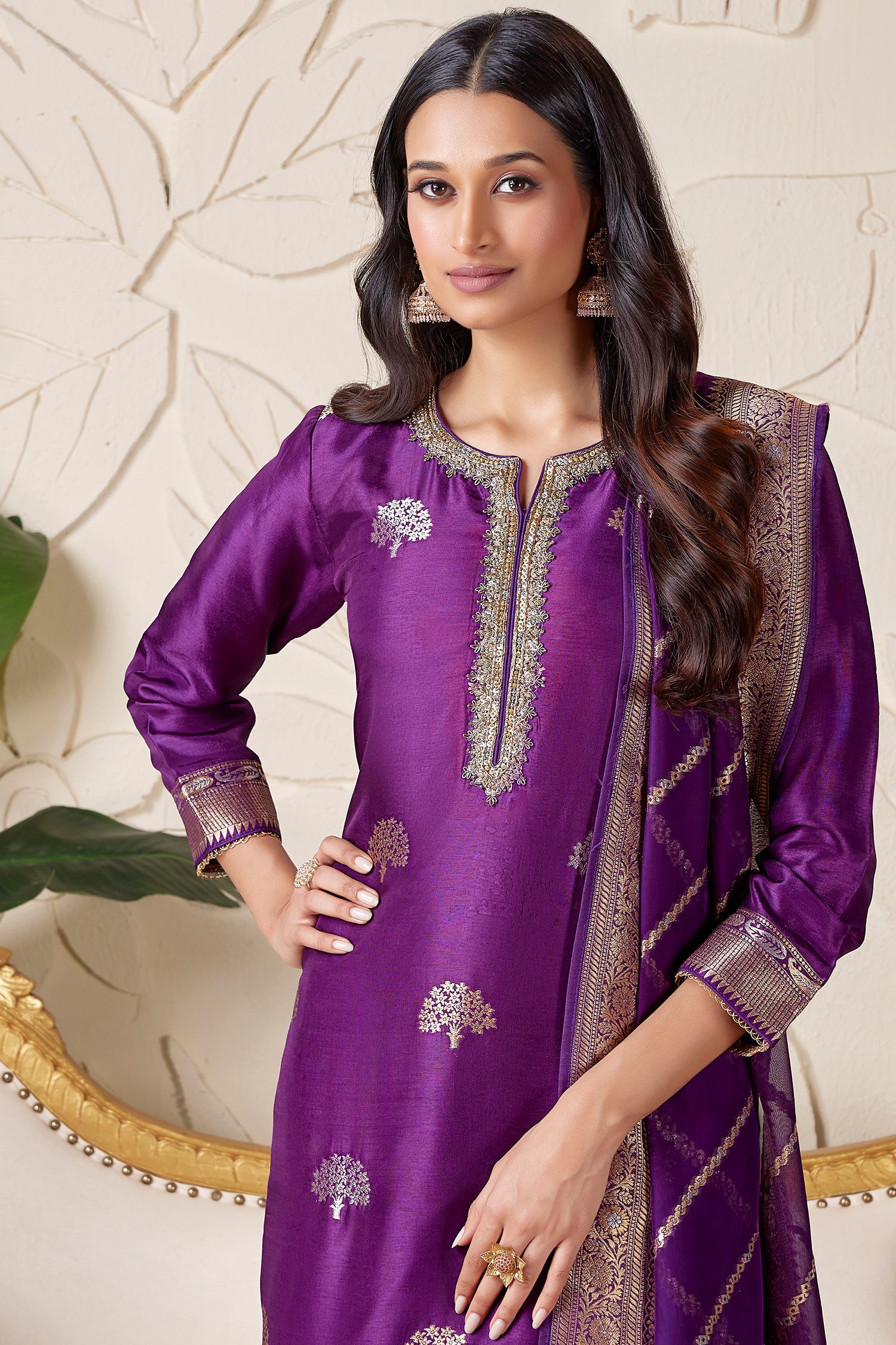 A luxurious dark violet purple straight cut suit crafted in rich satin organza, highlighted with elegant woven detailing for a refined festive appeal. The smooth texture and subtle sheen add a sophisticated charm to the silhouette. Designed to offer a graceful fall with contemporary elegance. Perfect for celebrations, evening gatherings, and special occasions.