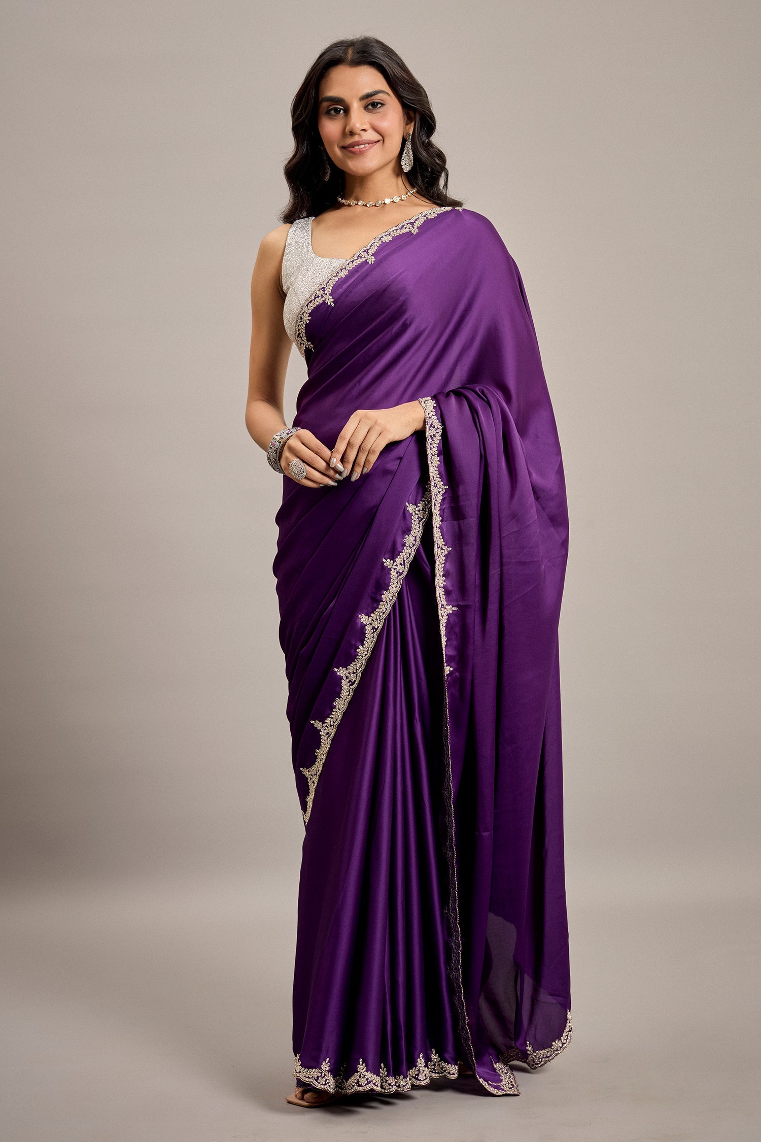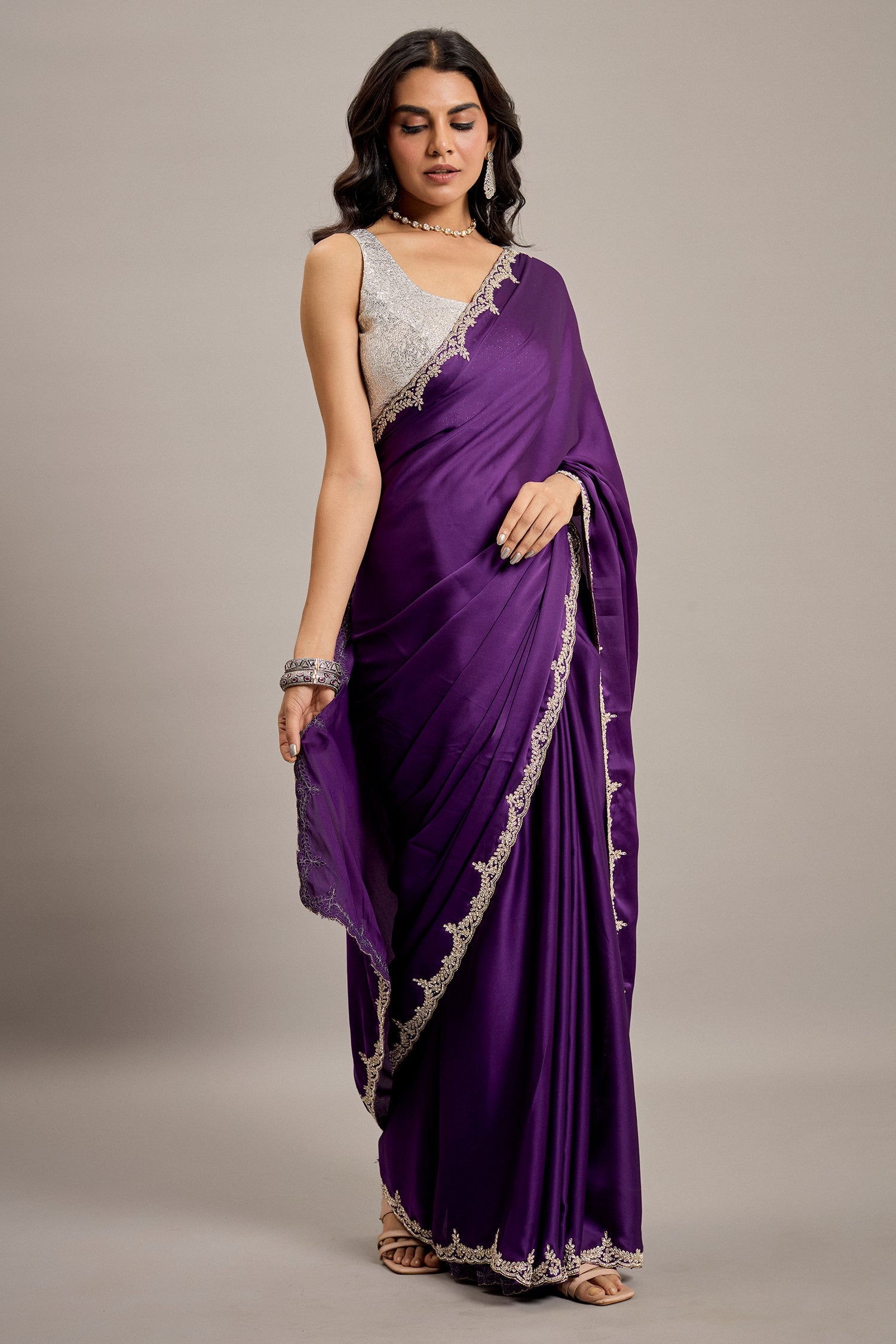 Make a striking statement with this Deep Violet Satin Crepe Silk Saree, crafted for effortless elegance. The smooth satin crepe fabric offers a fluid drape with a subtle sheen. Highlighted by a refined diamond embellishment border, it adds a touch of sparkle and sophistication. Ideal for evening functions, festive occasions, and celebrations. Style it with minimal jewelry to let the saree shine.