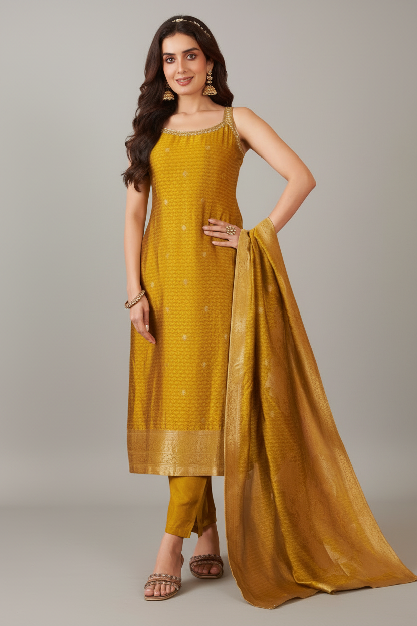 This elegant suit is crafted from rich golden art silk featuring a subtle woven texture that adds a refined sheen. The straight-cut kurta is paired with matching bottoms and a beautifully woven dupatta for a coordinated traditional look. Perfect for festive gatherings and special occasions, it offers a graceful blend of simplicity and sophistication.