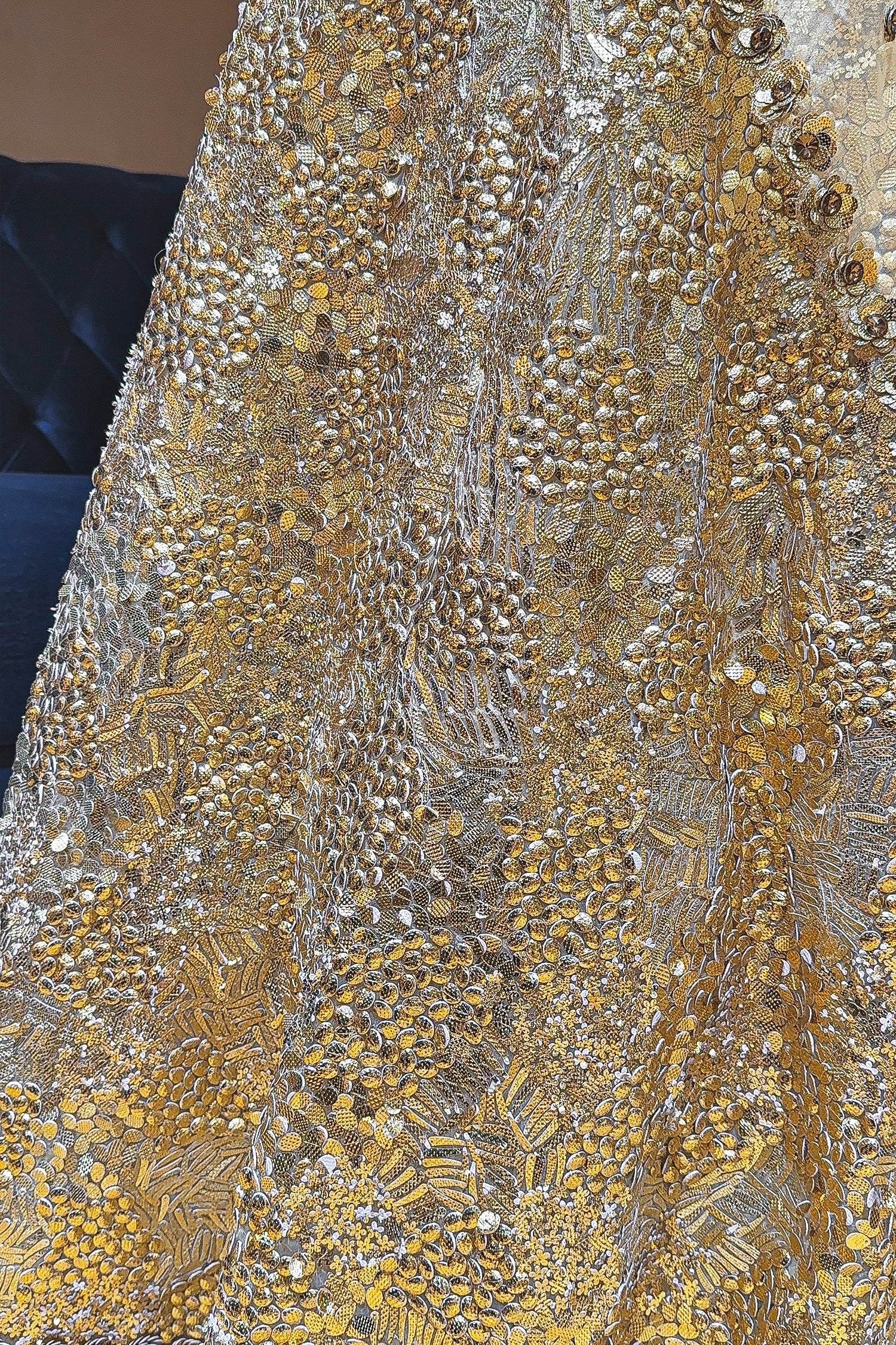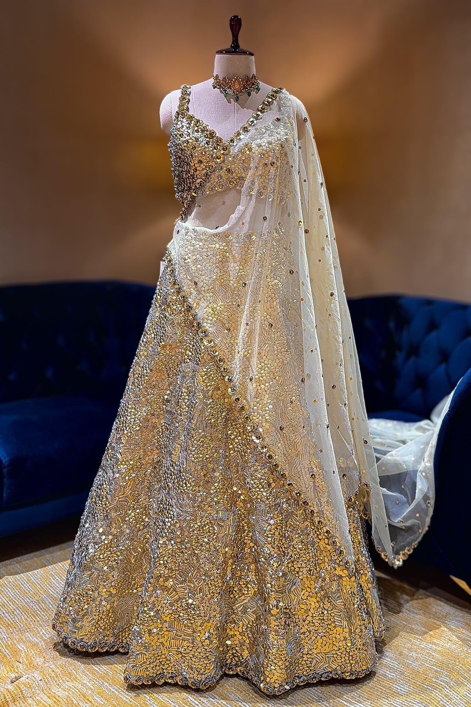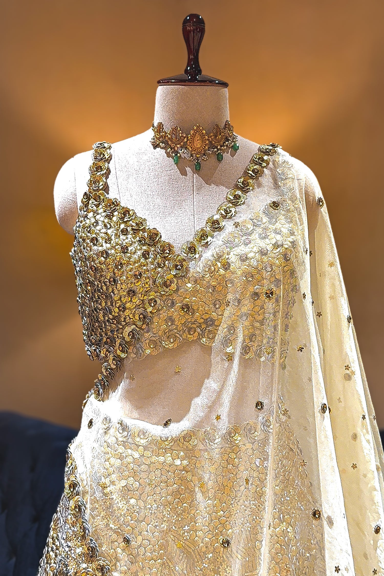 A masterpiece in radiant gold, this organza lehenga stuns with a tapestry of gold foil appliqué, 3D floral sequin rosettes, and multi-dimensional hand-embroidered metallic petals that create a sculpted, high-luxury texture. The blouse is enriched with 3D clustered sequin florals and reflective stone highlights, giving it a bold, couture-defined silhouette. A soft organza dupatta with delicate sequin butti detailing adds balance to this richly ornate ensemble. Drenched in brilliance from head to hem, this lehenga is crafted to make an unforgettable, golden-statement appearance at any grand celebration.