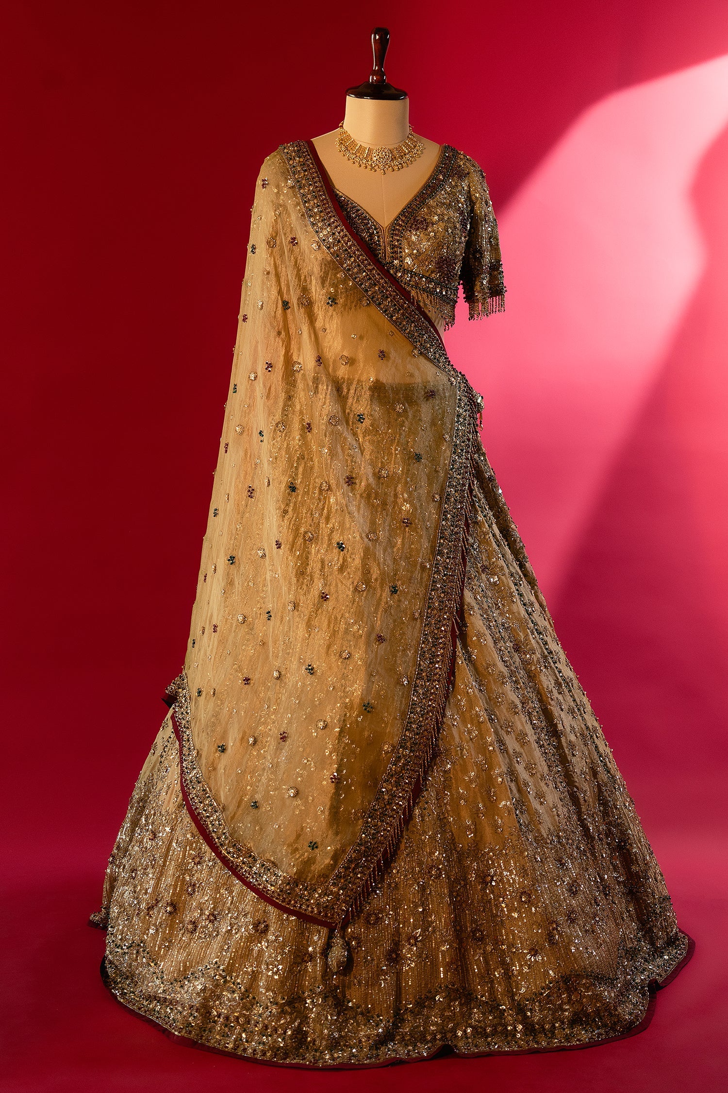 This golden tissue silk lehenga glows with all-over sequin, bead and crystal handwork, giving it a luminous bridal charm. The richly embellished blouse features intricate detailing with delicate beaded fringes for added movement. Its sheer dupatta, dotted with multi-hued accents and a heavily adorned border, adds refined elegance. A timeless pick for brides who desire shimmer, sophistication and regal grace.
