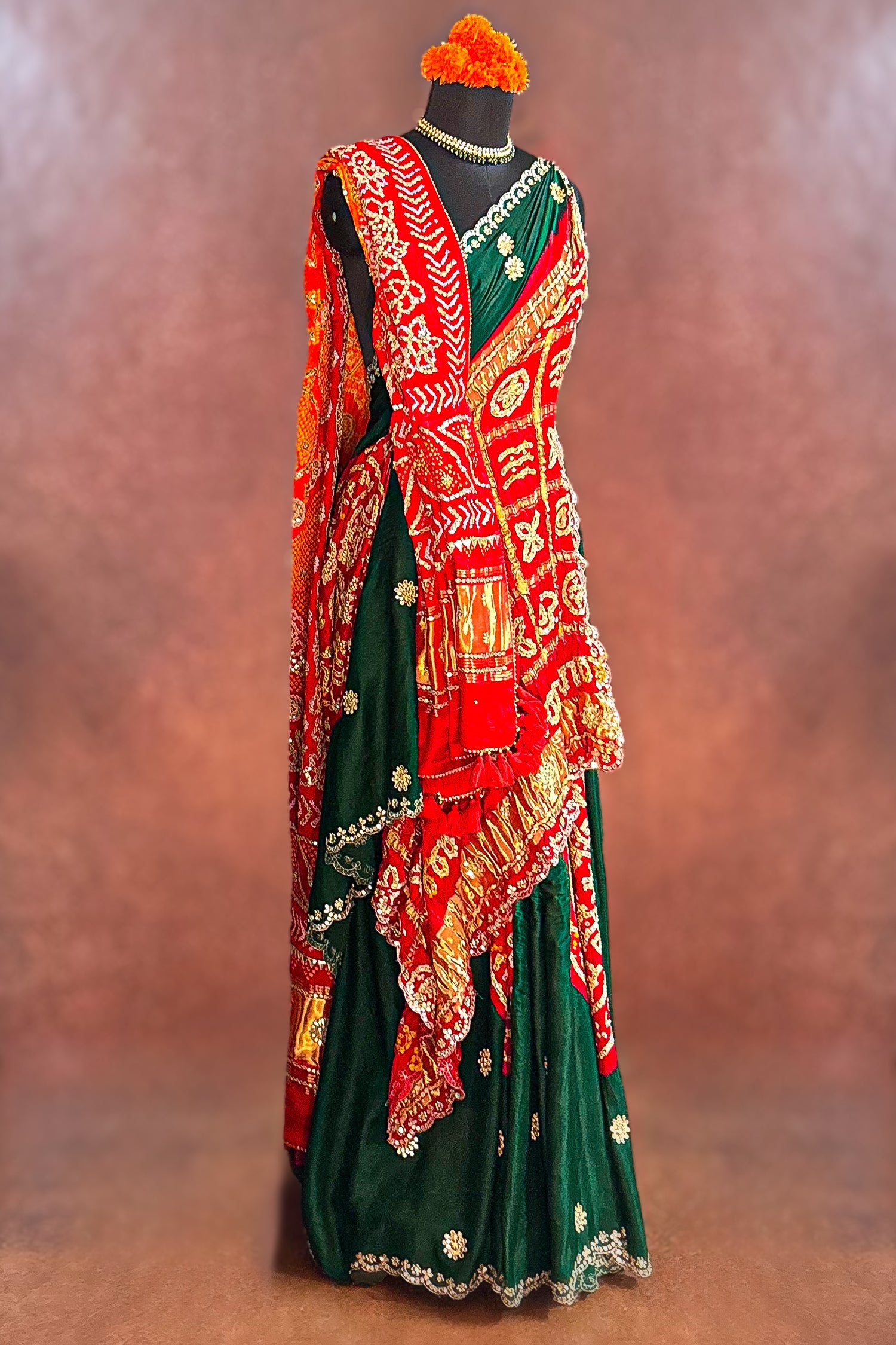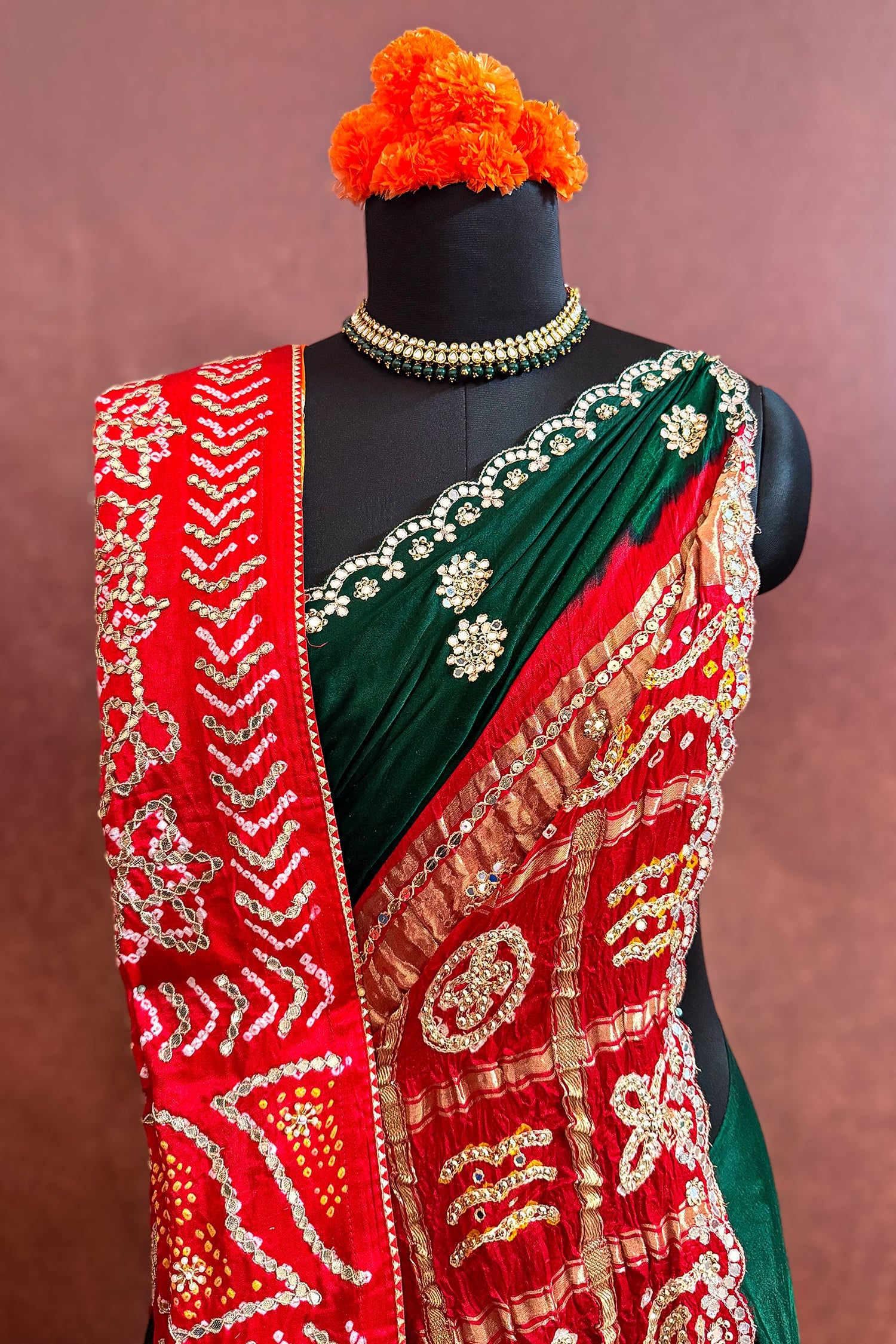 Step into timeless elegance with this exquisite green–red Gaji Silk Bandhej saree, crafted for those who appreciate heritage woven with luxury. The rich green body is adorned with traditional Bandhej motifs, creating a vibrant contrast against the deep red undertone. A highlight of this saree is its magnificent hand-appliqué border — featuring intricate thread florals, sparkling mirrors, delicate sequins and subtle contrast colours that add artistic depth. The border frames the drape beautifully, giving it a regal presence ideal for weddings, festivals and intimate celebrations. Complete with an unstitched blouse piece, this ensemble exudes unmatched luxury and refined elegance.