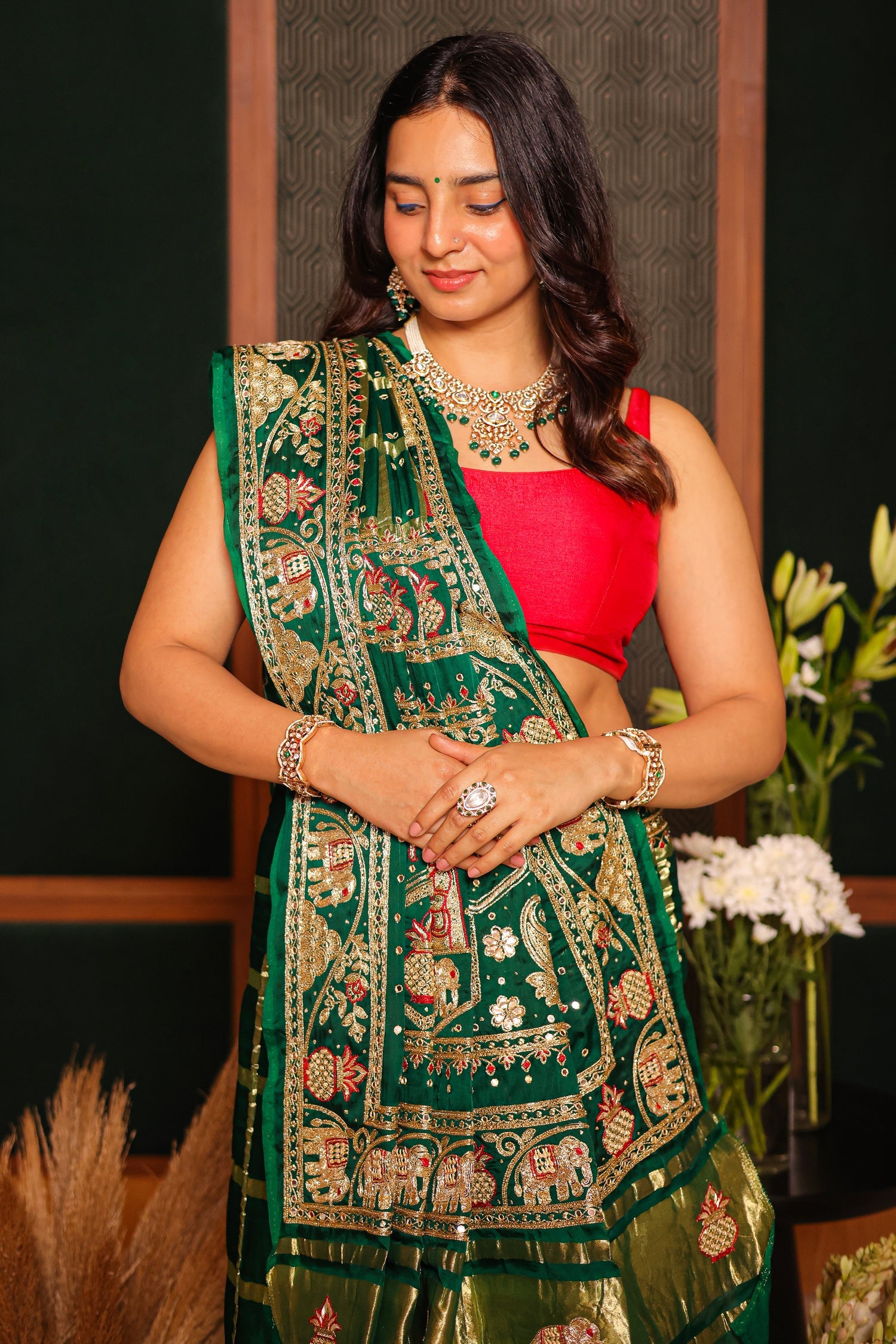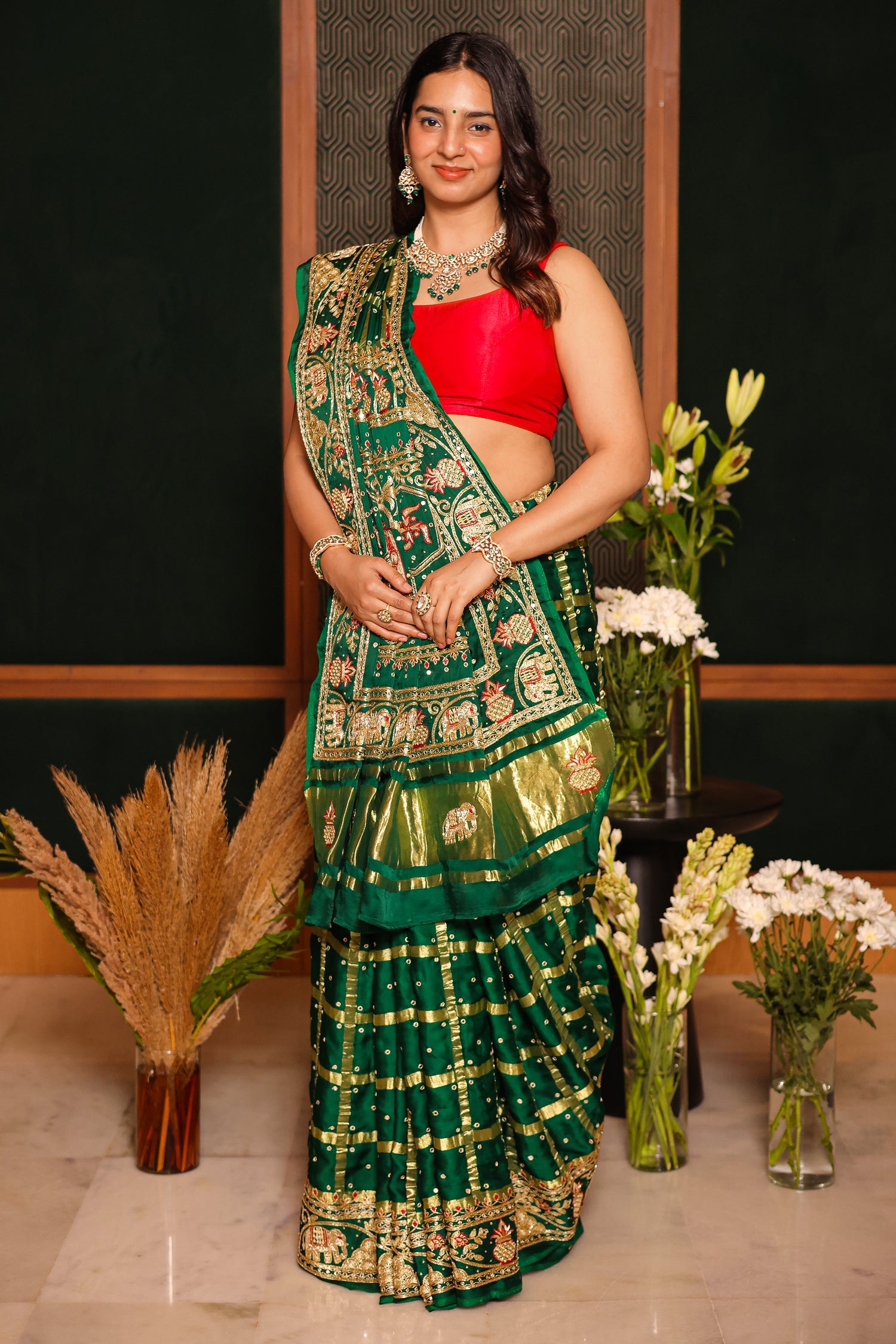 Elevate your festive wardrobe with our Green Gaji Silk Gharchola Saree, beautifully adorned with intricate zardosi handwork.The rich gaji silk drapes gracefully, highlighting the traditional gharchola patterns and exquisite detailing throughout.Its vibrant green hue and heritage craftsmanship make it a stunning choice for weddings and grand celebrations.