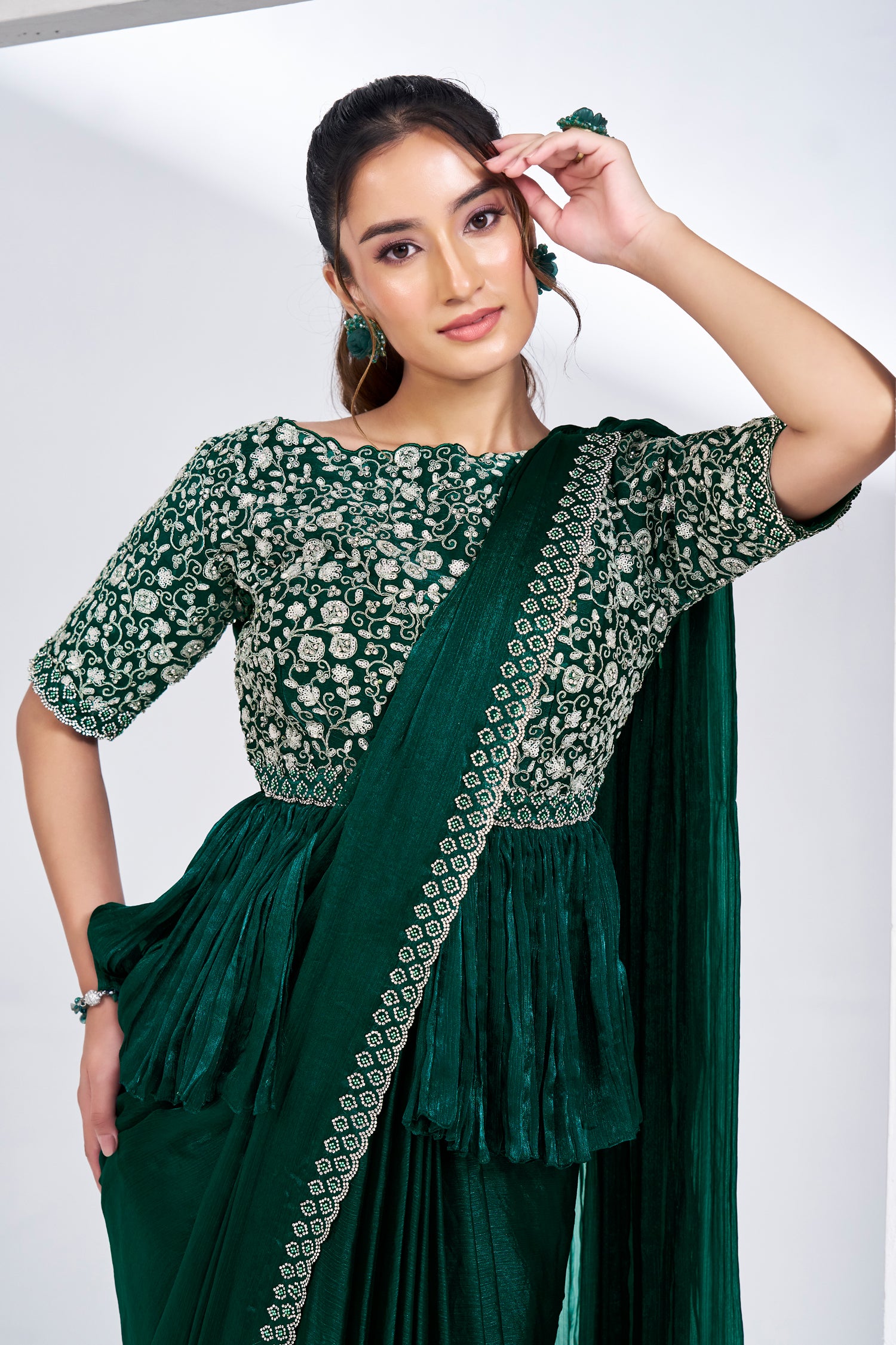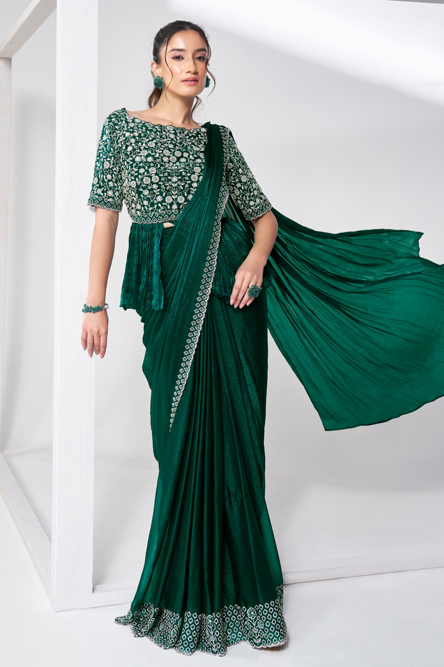 Redefine modern ethnic wear with this Green Shimmer Chiffon Readymade Saree. Featuring a designer Peplum style blouse, this pre-draped saree provides a flattering, structured silhouette. It is the ultimate party-wear ensemble for sangeets and cocktail nights.