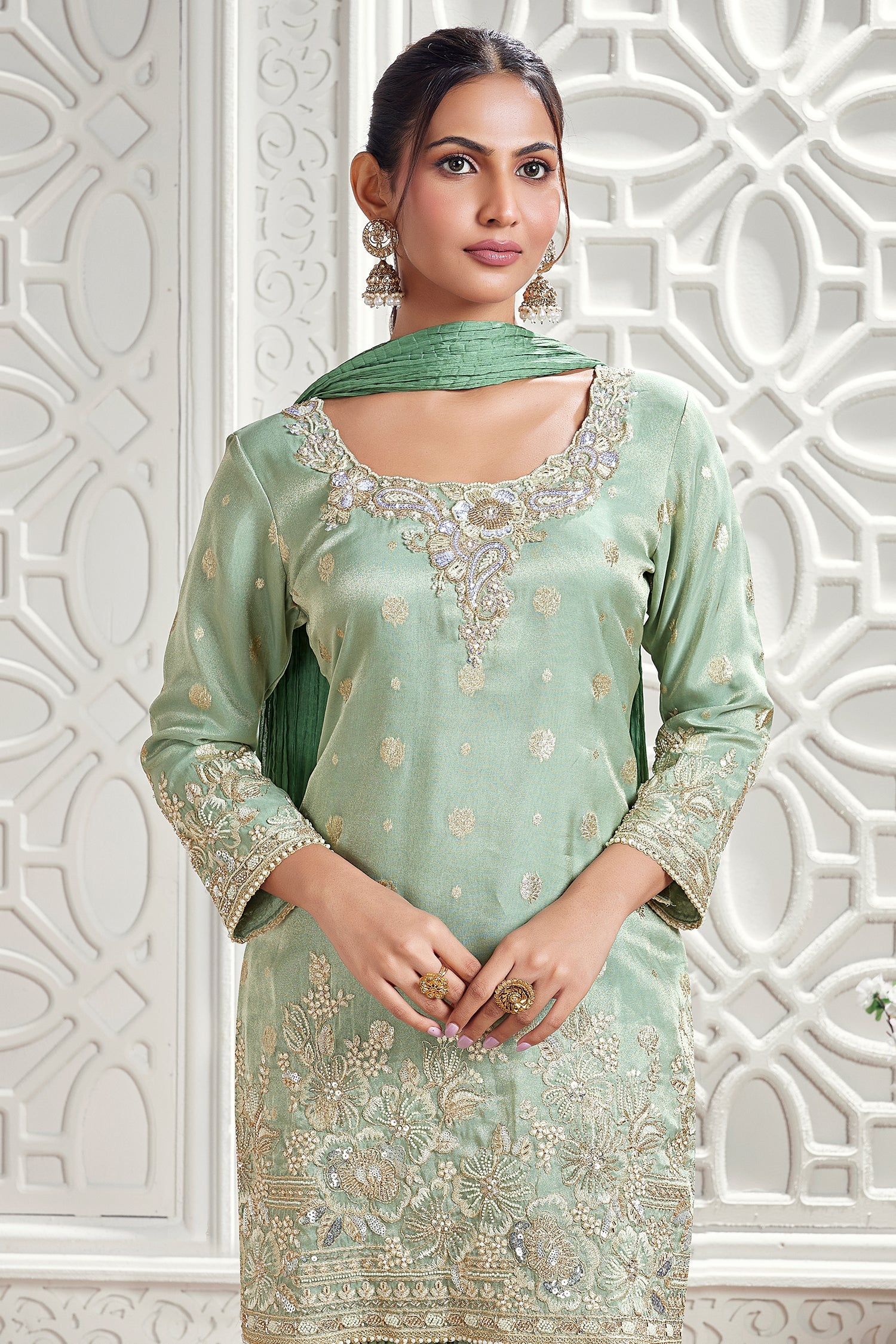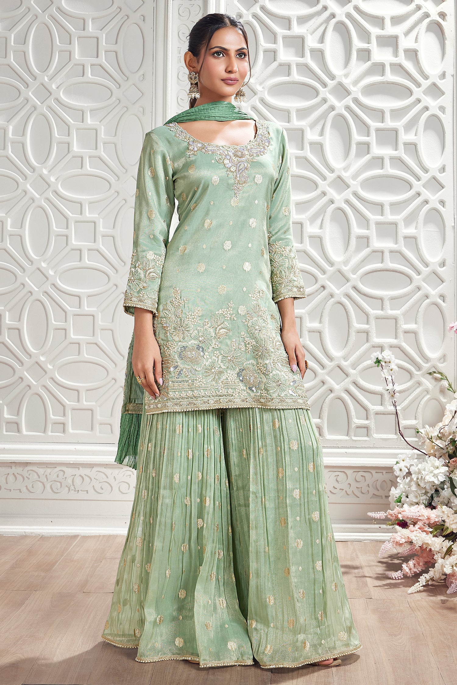 green tissue woven straight cut sharara suit crafted for effortless festive elegance. The kurta showcases finely woven buttis across the fabric, highlighted by intricate sequin and cutdana floral embroidery placed along the hemline. The neckline is enriched with detailed floral and paisley accents using beads and shimmering elements, creating a balanced yet striking finish. With its airy texture and subtle glow, this ensemble is well suited for daytime festivities and graceful occasions.