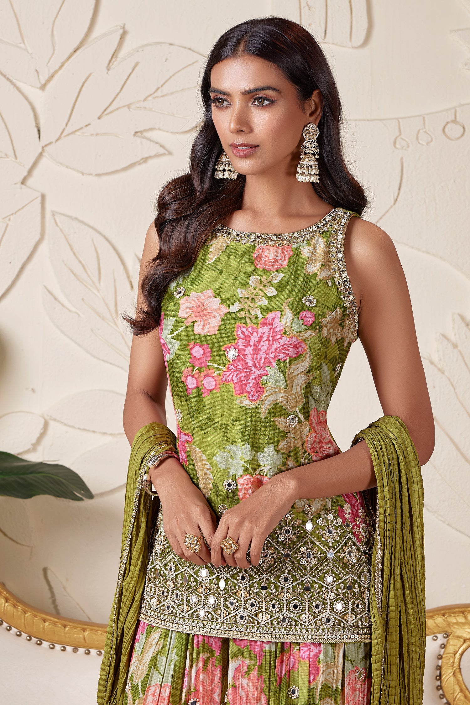 A rich green velvet palazzo suit that blends luxurious texture with festive detailing. The kurta showcases a vibrant floral print, accented with mirror, sequin, and cutdana work along the top and borders for a subtle shimmer. Paired with flowing palazzo pants, the ensemble combines graceful movement with refined sparkle, making it perfect for festive occasions and celebratory gatherings.