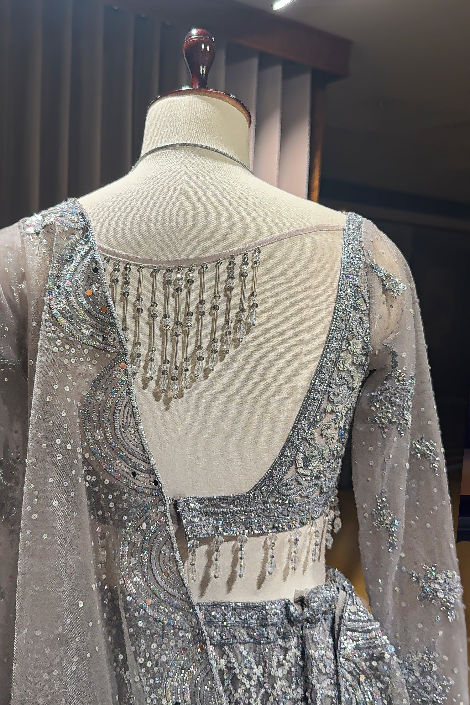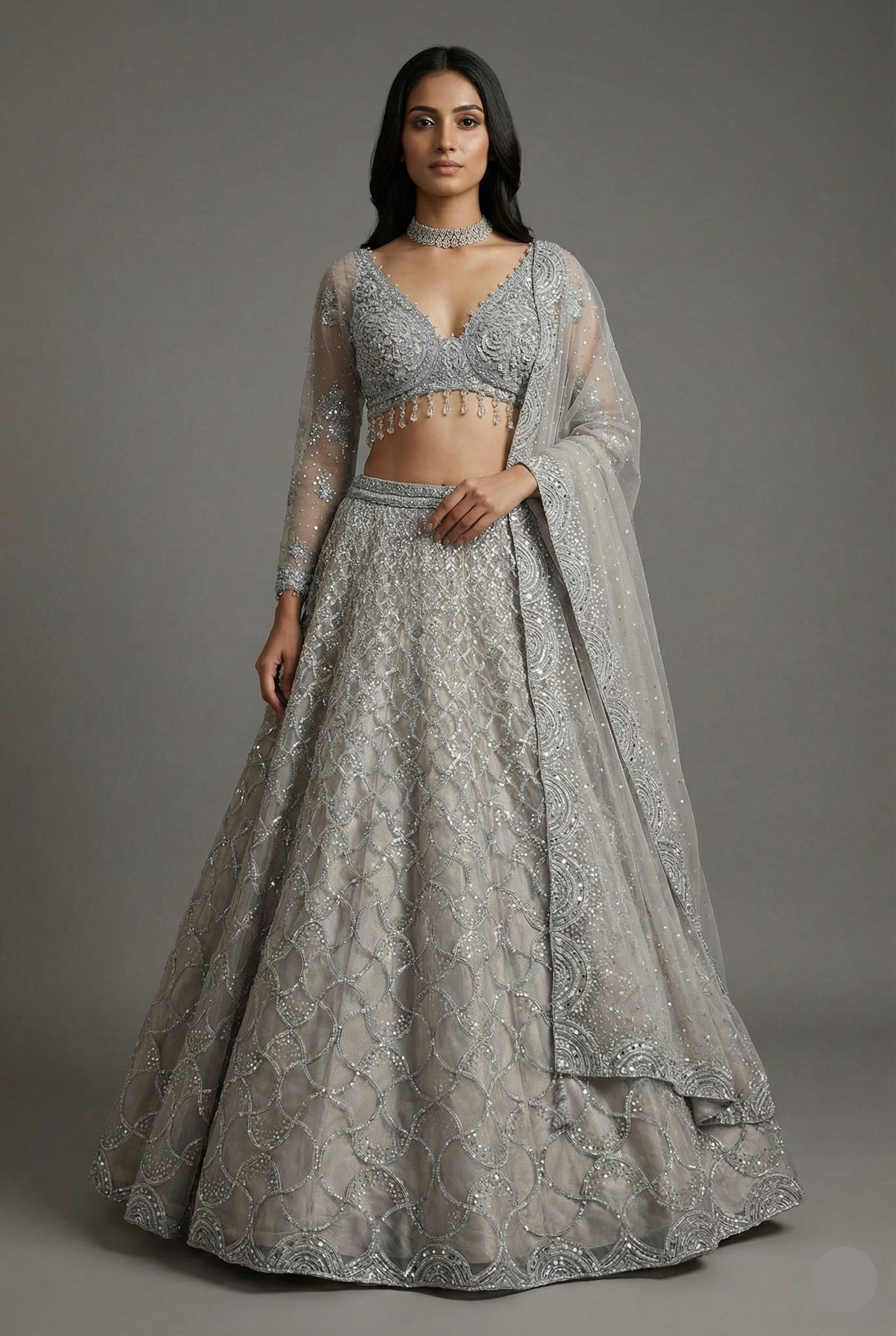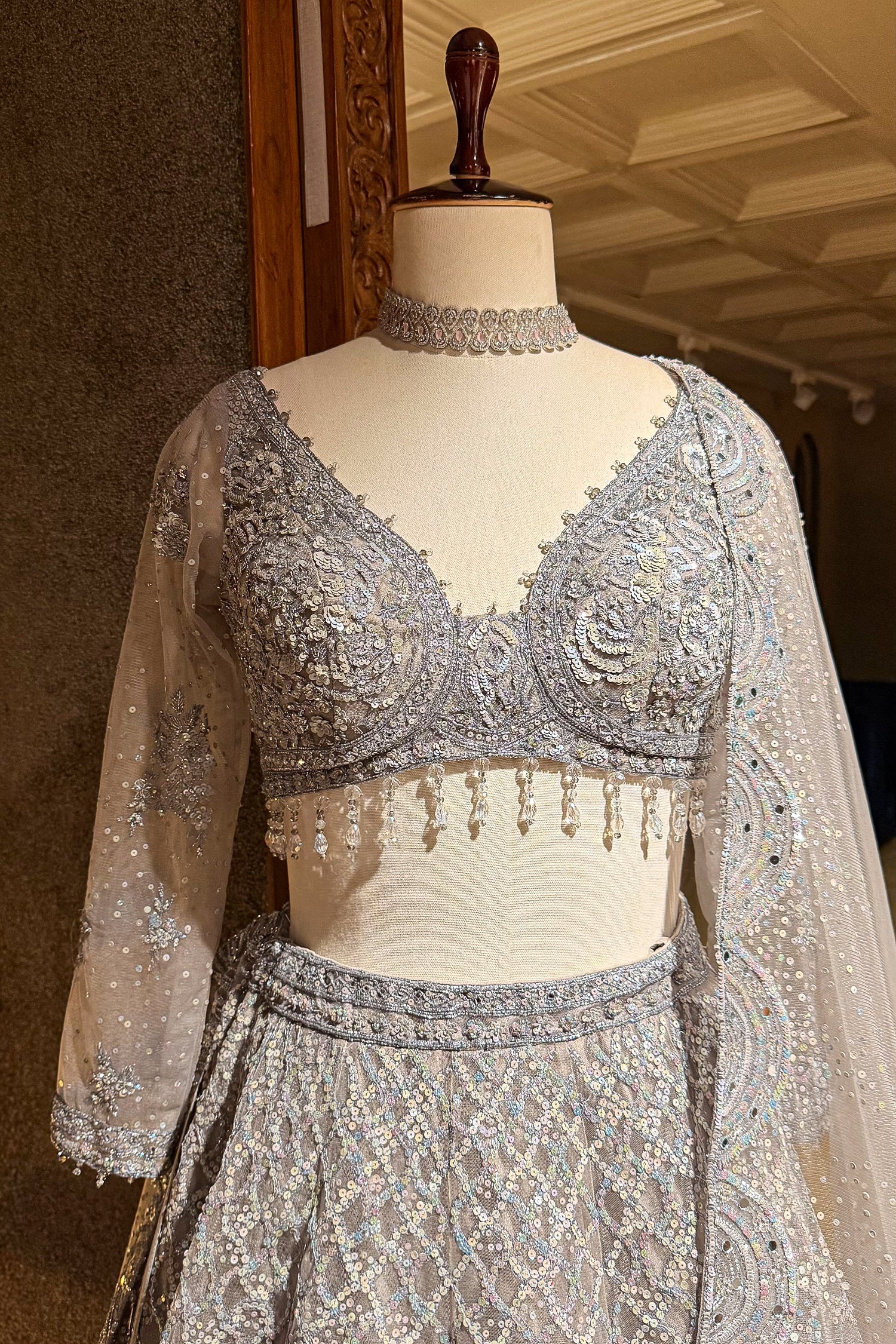 This elegant grey net lehenga features all-over sequin and mirror embellishments that create a soft, luminous shimmer from every angle. Paired with a beautifully detailed blouse and a sheer embroidered dupatta, the ensemble blends sophistication with contemporary charm. Perfect for receptions, sangeet nights, and evening celebrations, this lehenga offers a refined yet glamorous look.