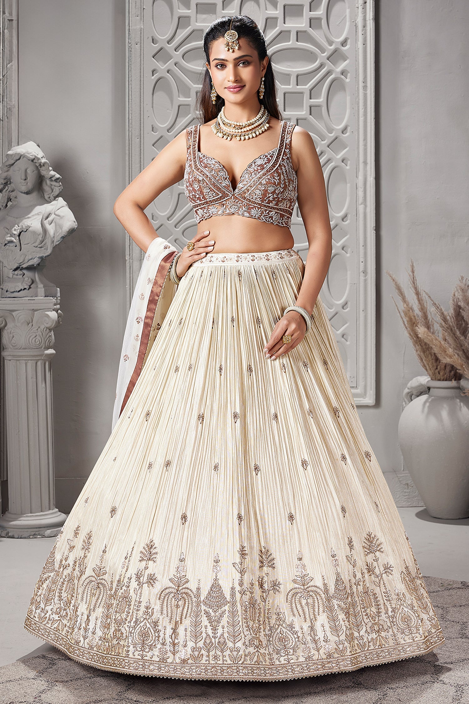 This elegant ivory cream lehenga features intricate sequin and thread embroidery along the hem and scattered motifs throughout, creating a regal and graceful look. The matching blouse is beautifully detailed with delicate embroidery and a stylish deep back design with tassel ties, adding a modern touch. Crafted with flowing fabric, the skirt offers a voluminous, flattering silhouette perfect for weddings or festive occasions. Complete the ensemble with a coordinating dupatta for a timeless traditional appeal.