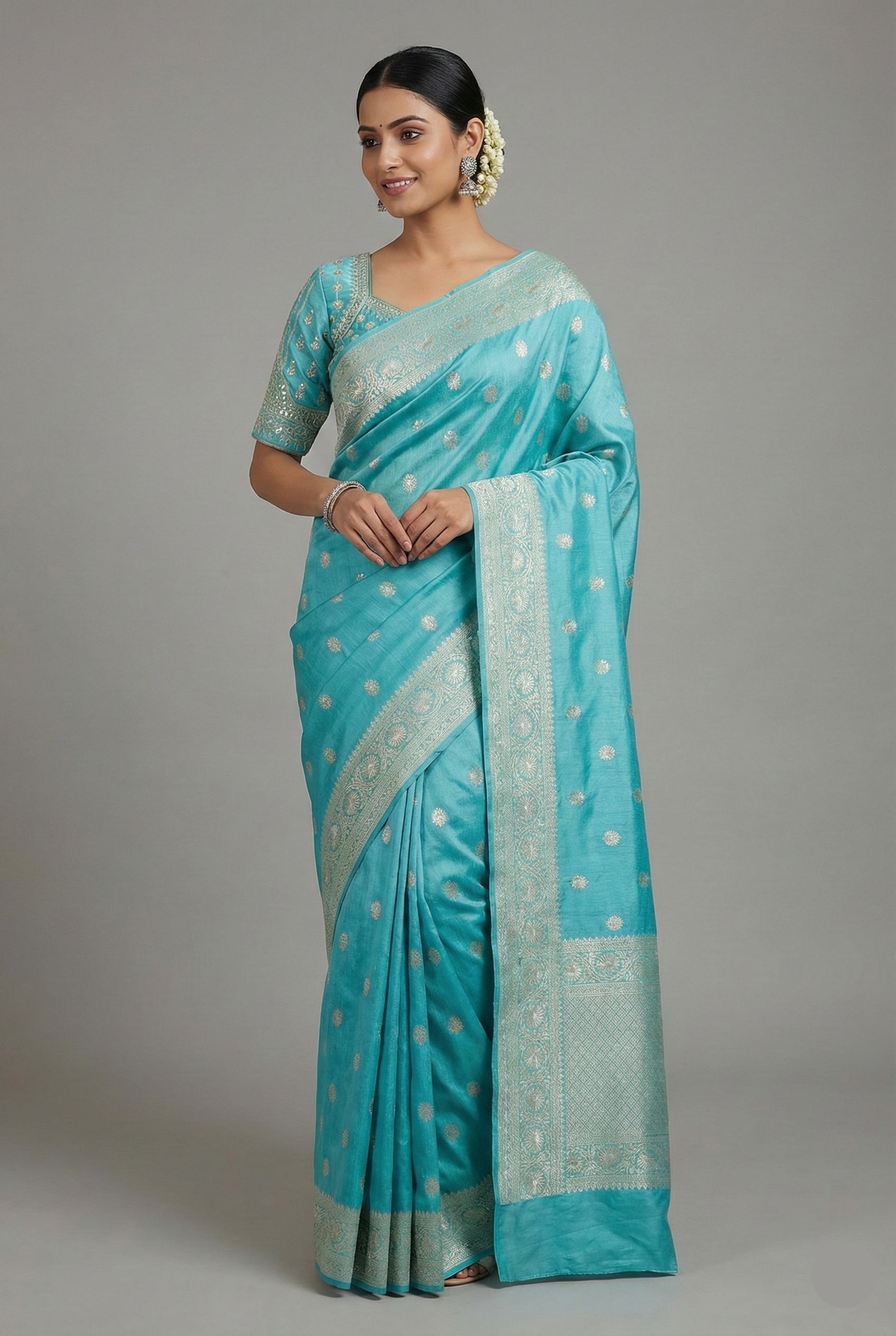 The blue saree is crafted from rich silk fabric, offering a smooth texture. It is beautifully enhanced with intricate weaving, cutdana, beads, and zardosi work, adding a luxurious and festive appeal. Paired with a stitched silk blouse in matching blue color, this attire is perfect for weddings, celebrations, and special occasions.