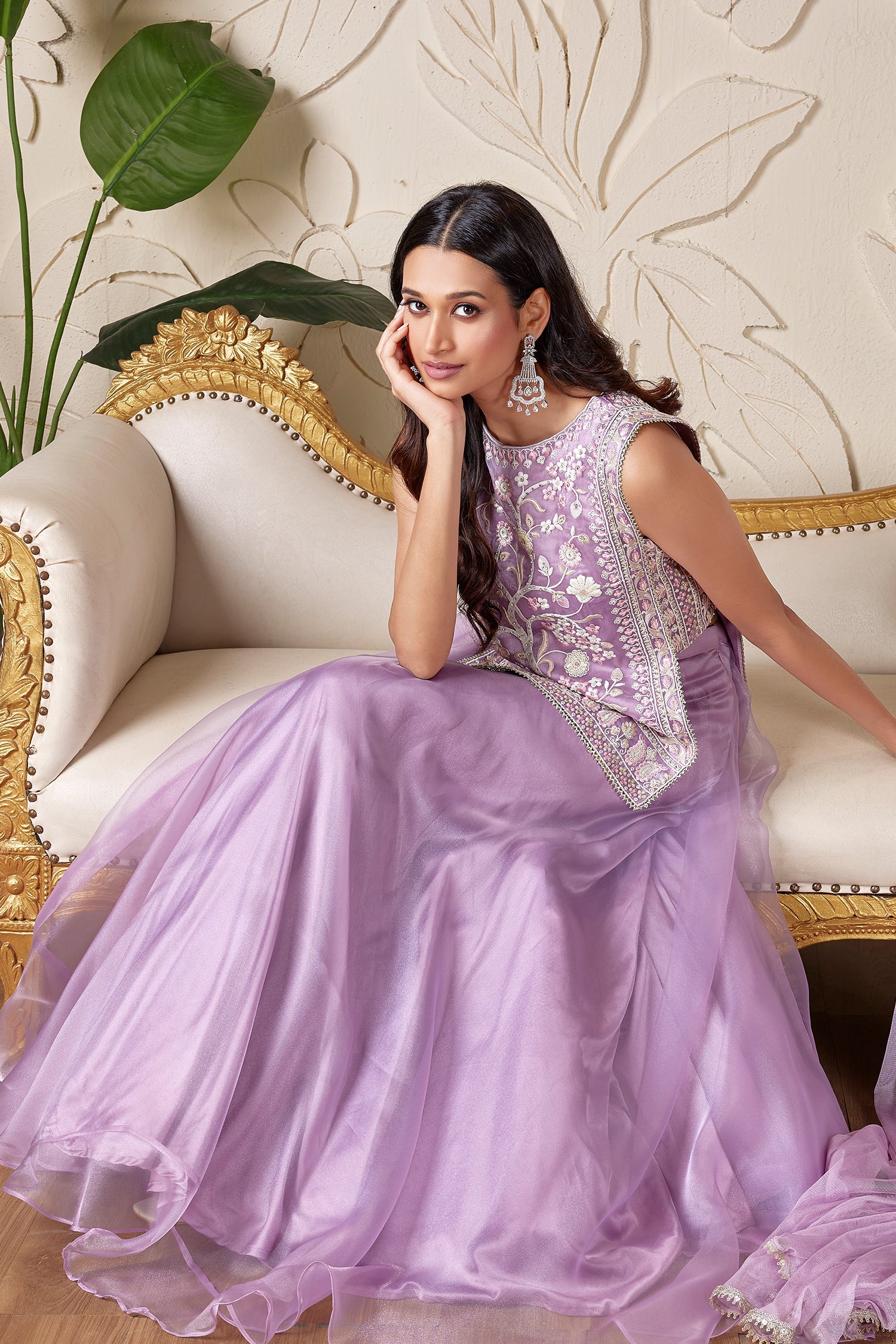 A dreamy lilac ensemble that radiates modern elegance, this Indo Western suit is crafted in soft glass tissue organza. The top features delicate floral embroidery, creating a graceful interplay of texture and shimmer. Its flowing silhouette paired with subtle detailing makes it perfect for festive gatherings or evening soirees.