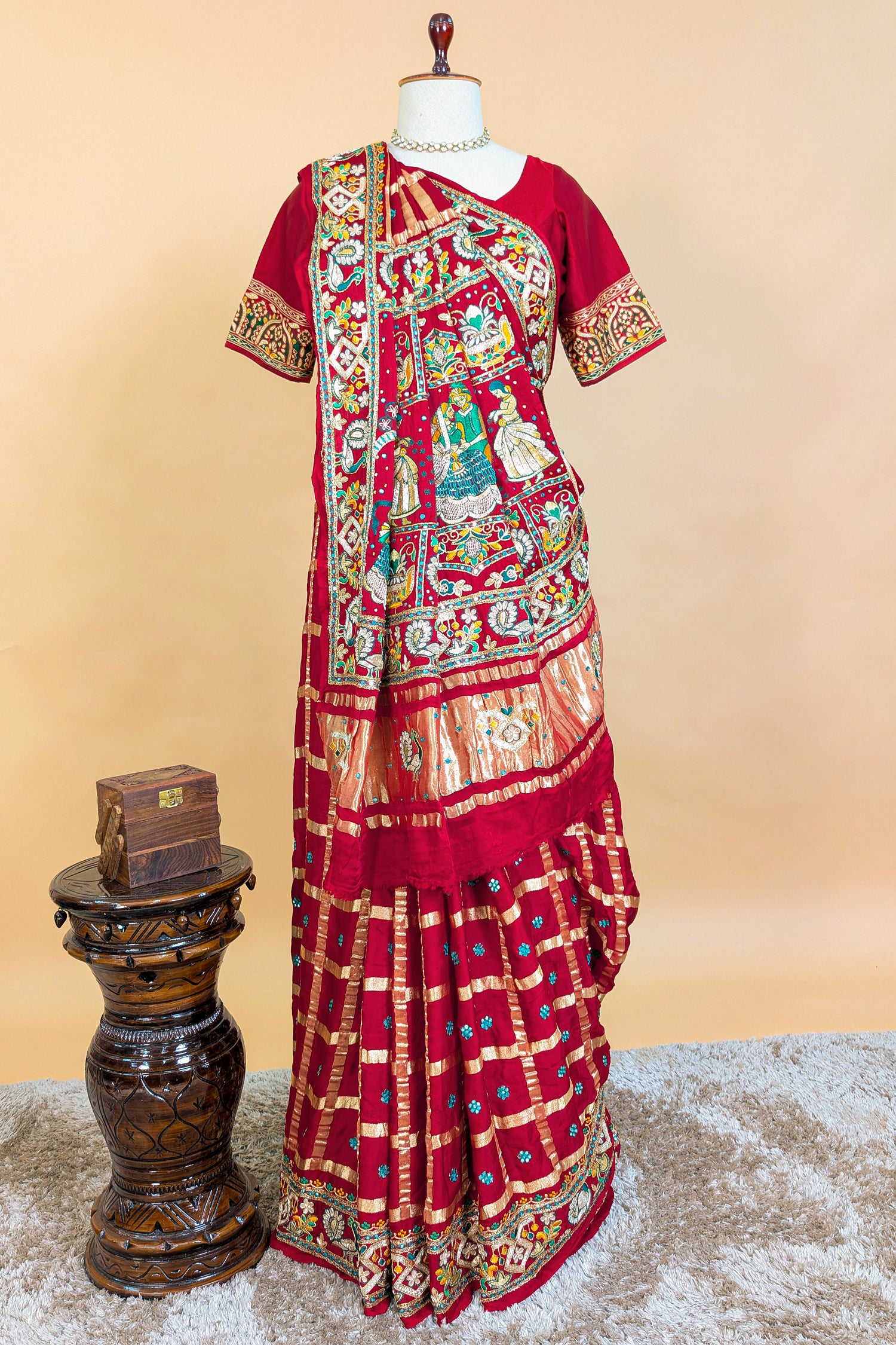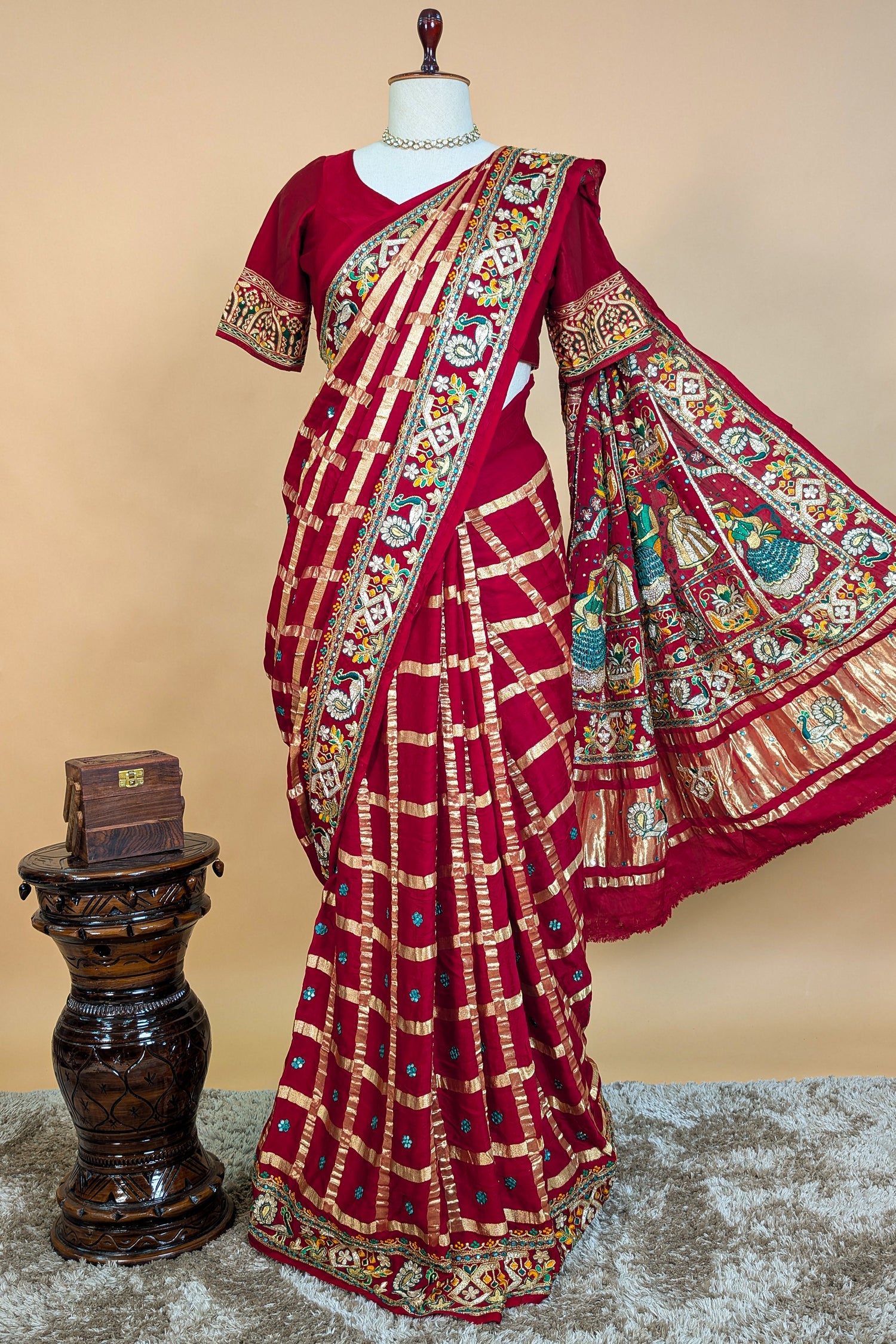 This exquisite maroon Gaji silk Gharchola saree features classic traditional checks highlighted beautifully across the body. The rich Gaji silk fabric enhances the drape with its natural sheen, while the saree’s timeless Gharchola pattern lends a regal touch. The pallu is adorned with heavy, intricate embroidery, adding depth, texture, and a luxurious finishing detail. The matching blouse worn in the picture is the same blouse piece provided with the saree.Complete with an unstitched blouse piece, this ensemble exudes unmatched luxury and refined elegance
