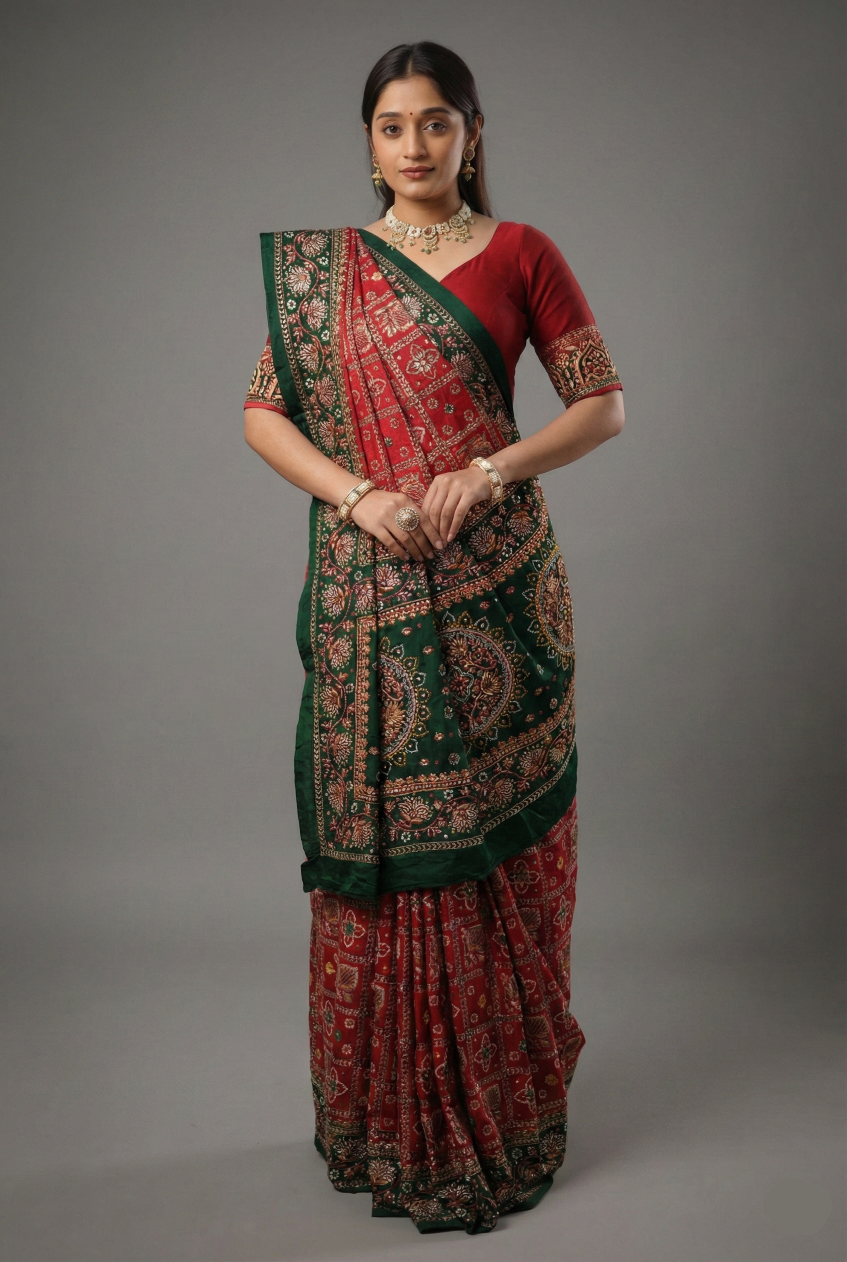 This Maroon Gaji Silk Traditional Gharchola Saree is a breathtaking masterpiece of heritage craftsmanship, featuring the signature checkered grid pattern synonymous with authentic Gharchola artistry. The rich maroon body is stunningly offset by a vibrant green contrast pallu and border, which are heavily adorned with traditional motifs and shimmering golden weaving. Intricate hand-embroidery and delicate accents along the border provide a luxurious, high-fashion finish to the lustrous Gaji Silk fabric. Designed for a regal silhouette, this saree is the perfect choice for weddings, traditional rituals, and grand festive celebrations. Complete with an unstitched blouse piece, this ensemble exudes unmatched luxury and refined elegance.