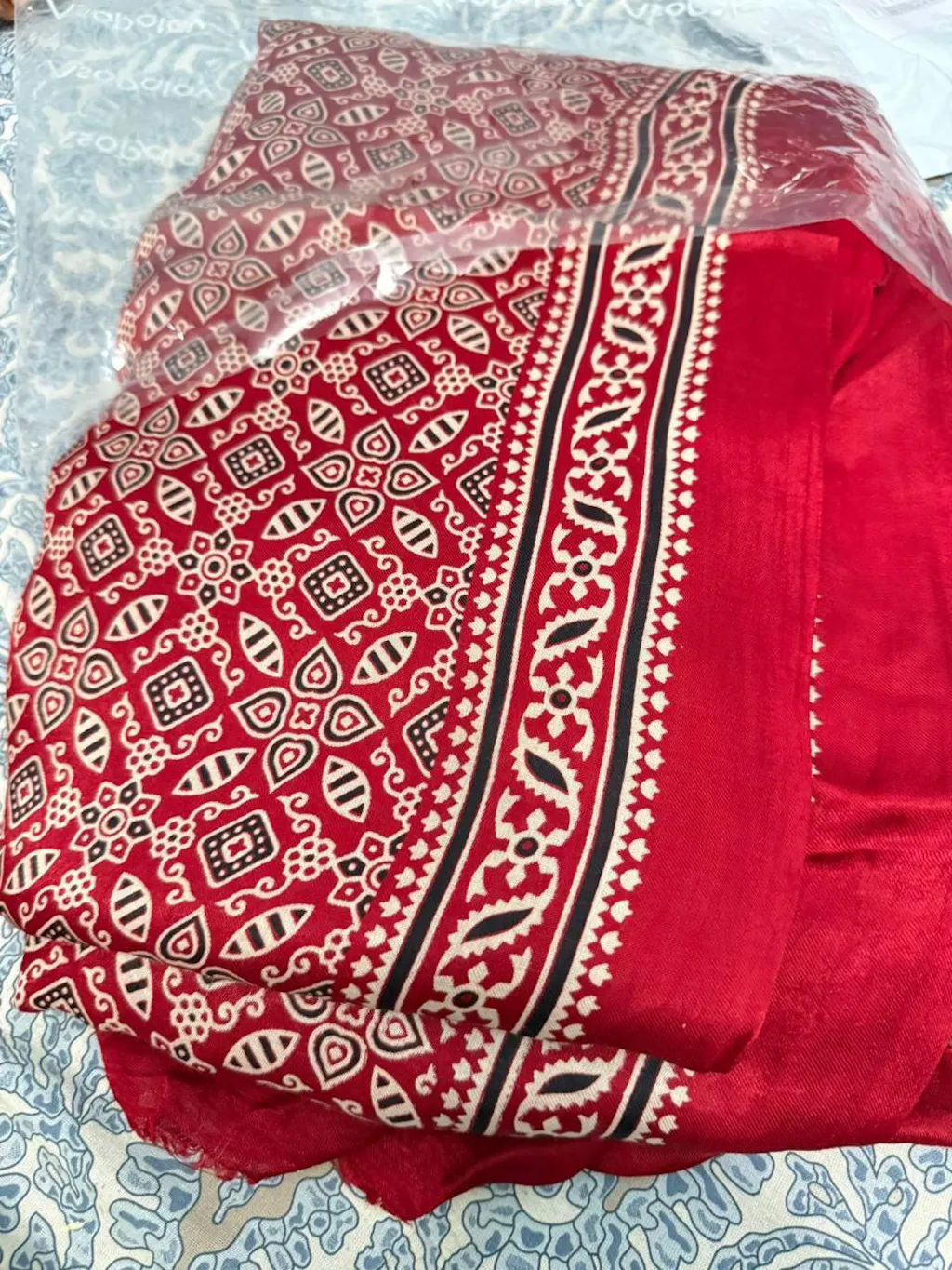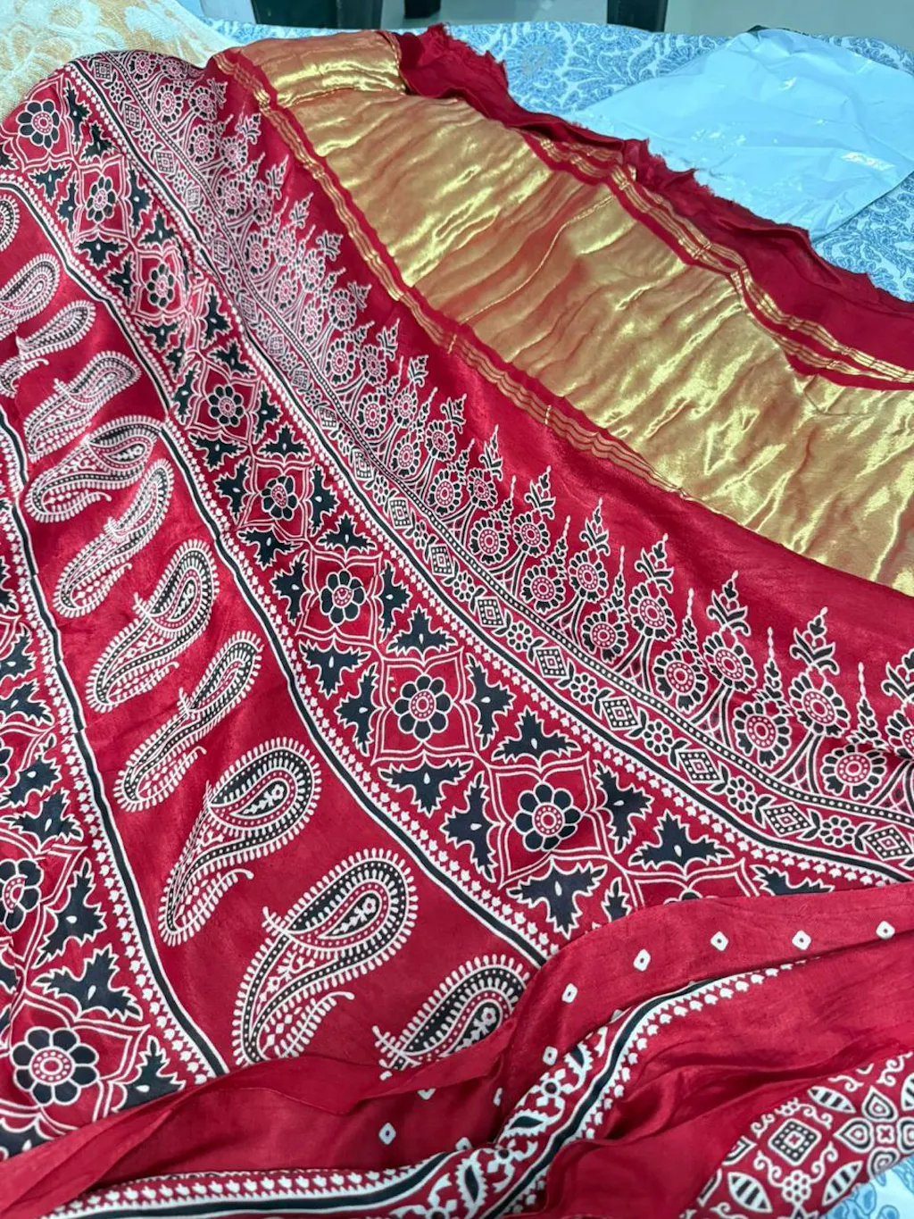 Embodying the soulful artistry of desert landscapes, this maroon saree is masterfully crafted from premium Modal Silk, renowned for its luxurious sheen and eco-friendly drape. The saree features authentic Ajrakh hand-block printing, showcasing intricate geometric and floral patterns achieved through a complex, time-honored dyeing process. A defining highlight is the elaborate pallu, which displays a dense arrangement of traditional motifs and shimmering gold-toned stripes. Perfectly merging earthy heritage with modern sophistication, this saree is a versatile masterpiece for cultural events, high-teas, and formal celebrations.