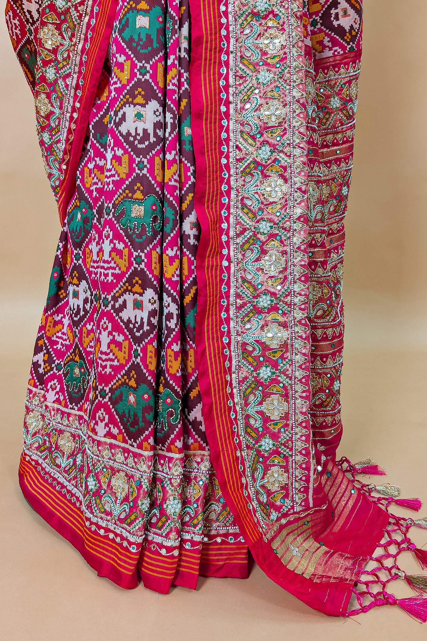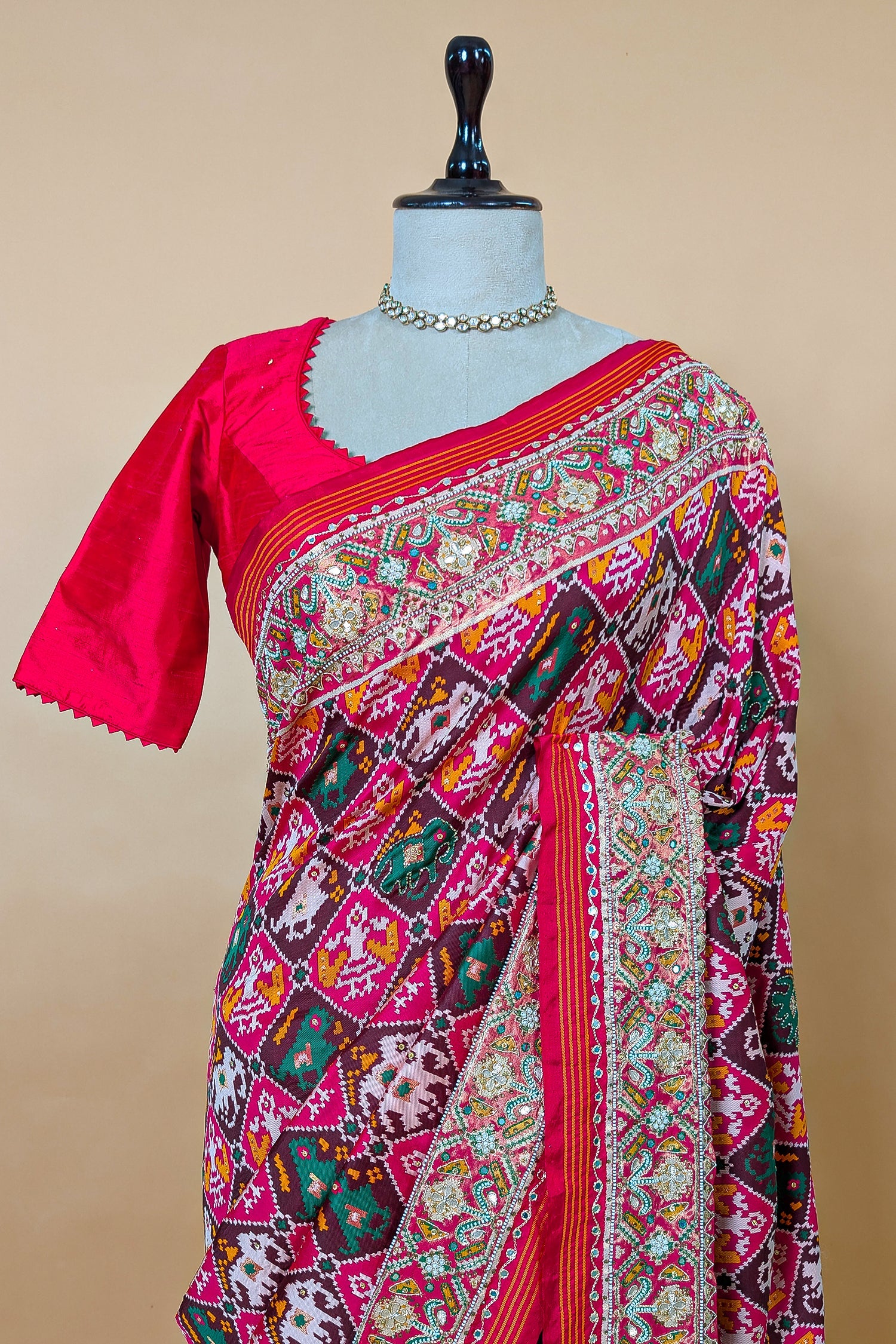 Celebrate the soul of Indian heritage with this Multi-Colored Silk Patola Saree, featuring the timeless "Checks" pattern. The saree is a symphony of vibrant jewel tones, where each hand-woven block tells a story of tradition. The design is modernized with luxurious hand-embroidery, featuring Gota Patti, shimmering Beads, and fine Cutdana applique work scattered across the body and concentrated along the borders. This "Fusion Masterpiece" combines the structural beauty of Patola weaving with the high-end sparkle of Rajasthani hand-work, making it a stellar choice for weddings and festive occasions.