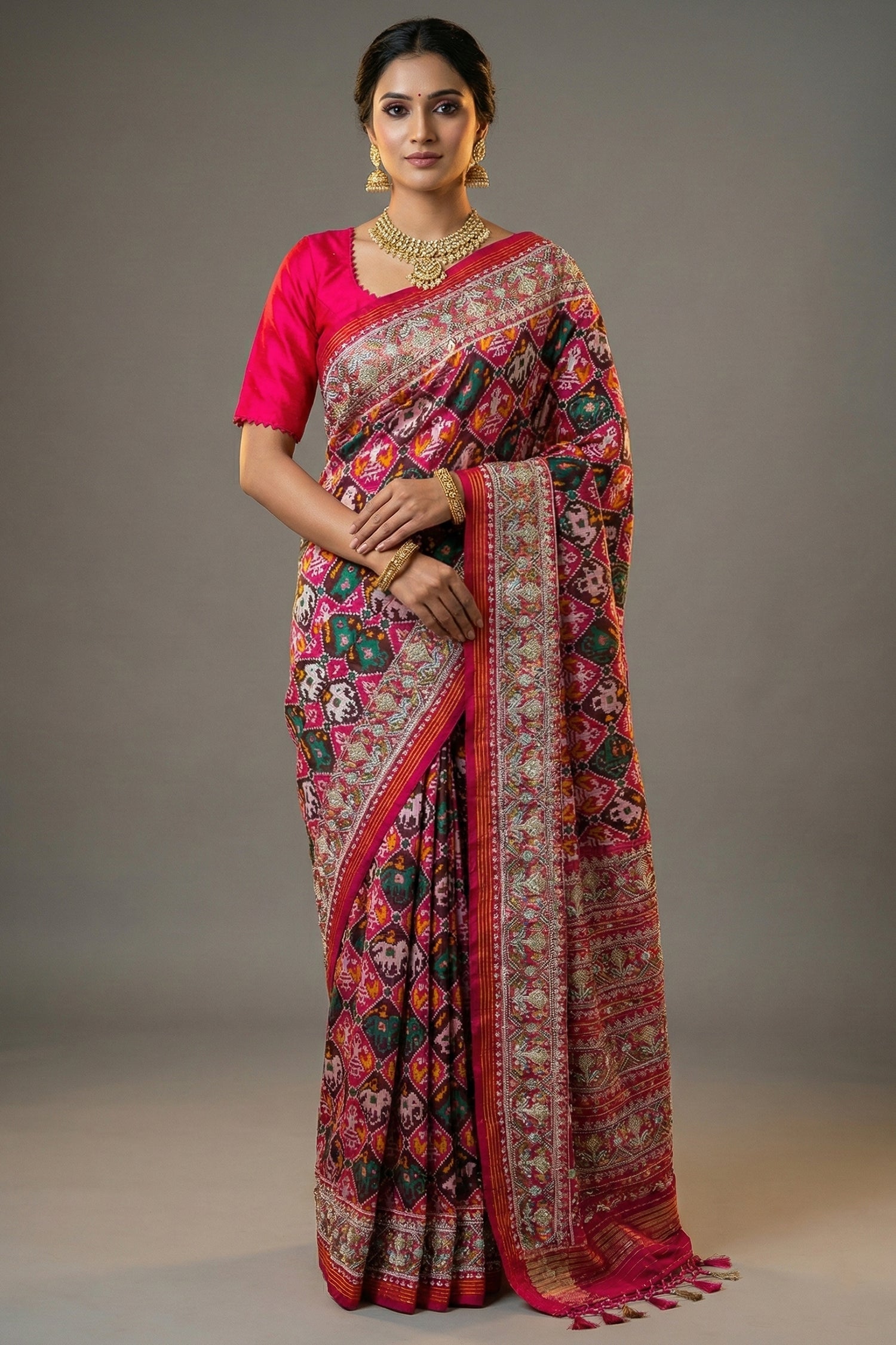 A: Yes. While traditional Patola is heavy, this silk is a "Soft-Finish" weave. It is thin enough to allow for multiple sharp pleats that sit flat against your stomach without making the waist area look bulky.