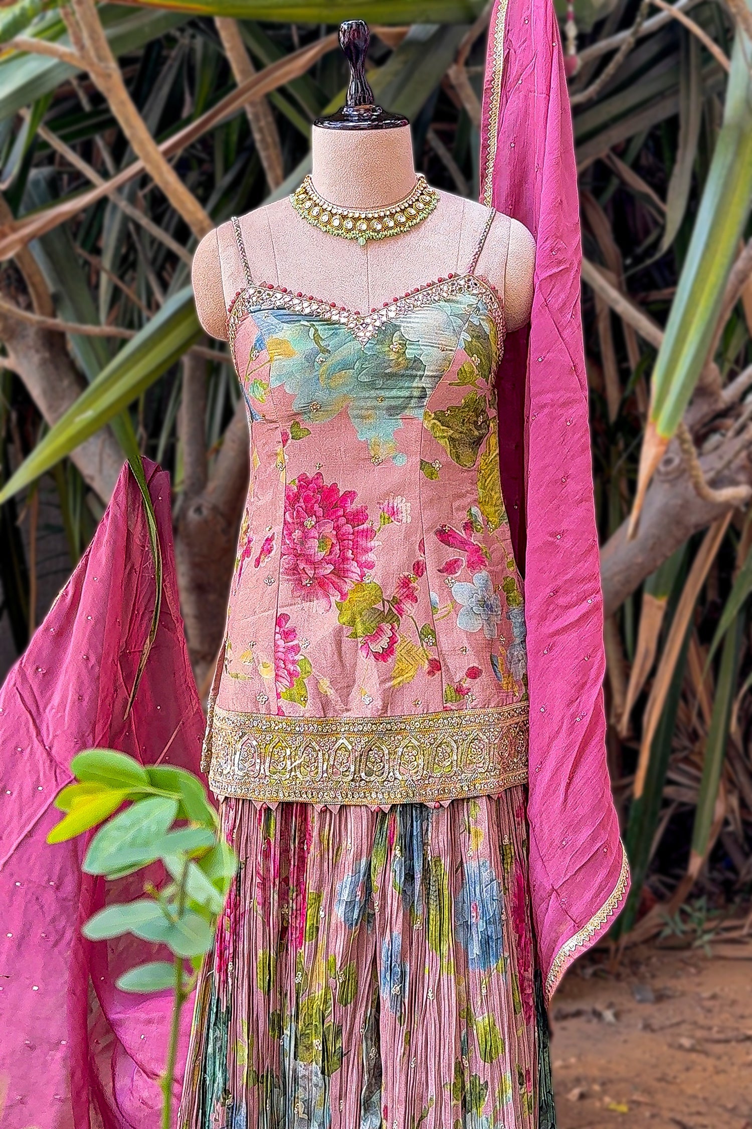 Indulge in the vibrant charm of this Multi-Colored Tissue Silk Ensemble, a perfect blend of modern silhouette and traditional craftsmanship. The set features a longline, sleeveless top crafted from luxurious tissue silk, boasting a vivid floral print in shades of pink, green, and blue. The sweetheart neckline is elegantly highlighted with intricate mirror work, stones, and beaded detailing that adds a regal shimmer to the festive look. The hemline of the top is finished with a wide, heavy border of gold embroidery and mirror work, creating a structured and sophisticated finish.Paired with this is a high-volume palazzo featuring matching floral prints and unique crinkled pleats that offer a fluid, dynamic movement. The palazzo is grounded by a deep, ornate embroidered border at the hem, mirroring the exquisite craftsmanship of the top. Completing the ensemble is a lightweight hot pink organza dupatta, accented with delicate gold borders and stonework, adding a final pop of color and grace.