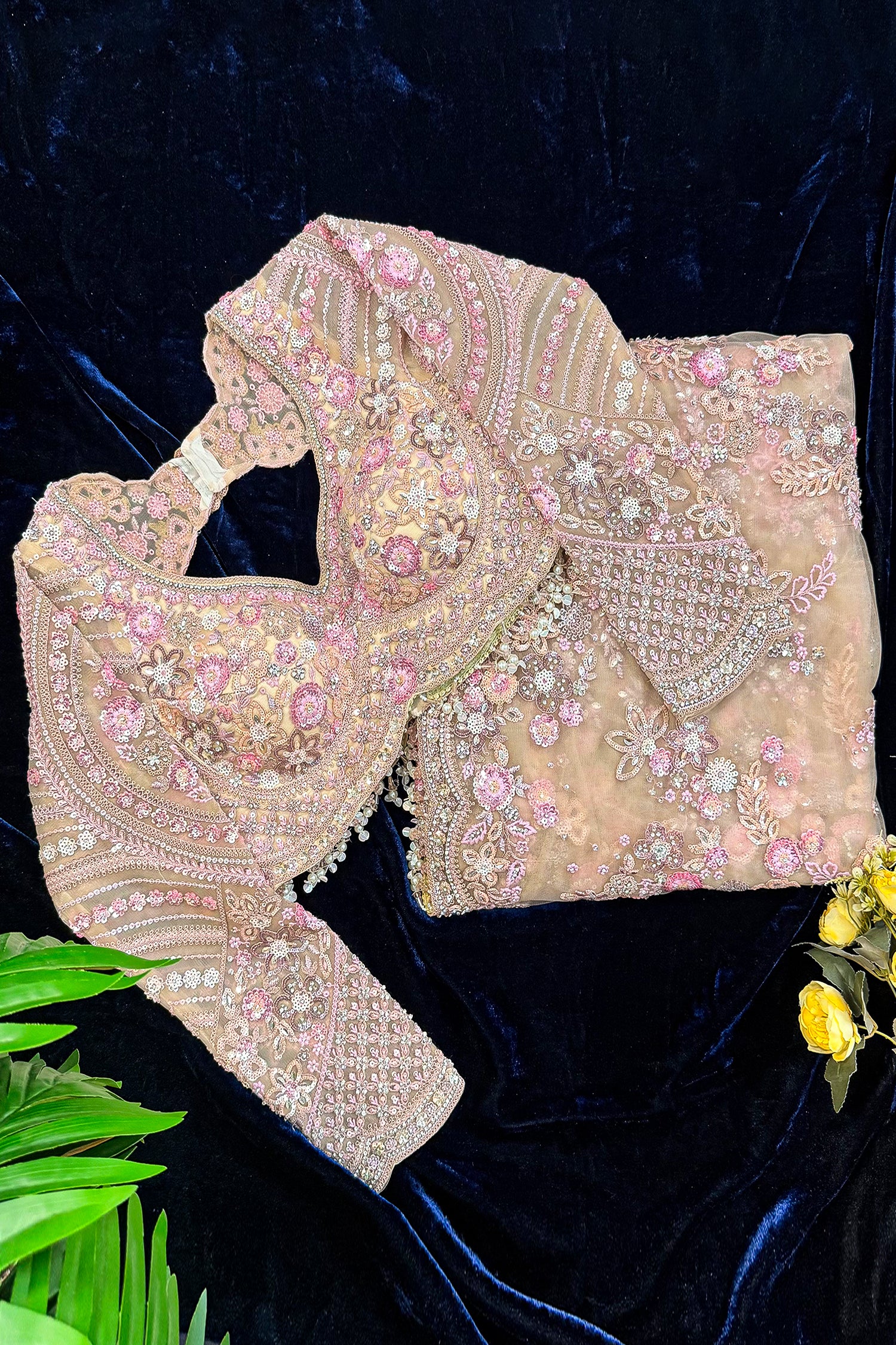 A: The base net is translucent, which is part of its modern appeal; however, the density of the floral sequin work provides elegant coverage. When worn with a matching petticoat, it creates a sophisticated and modest look.