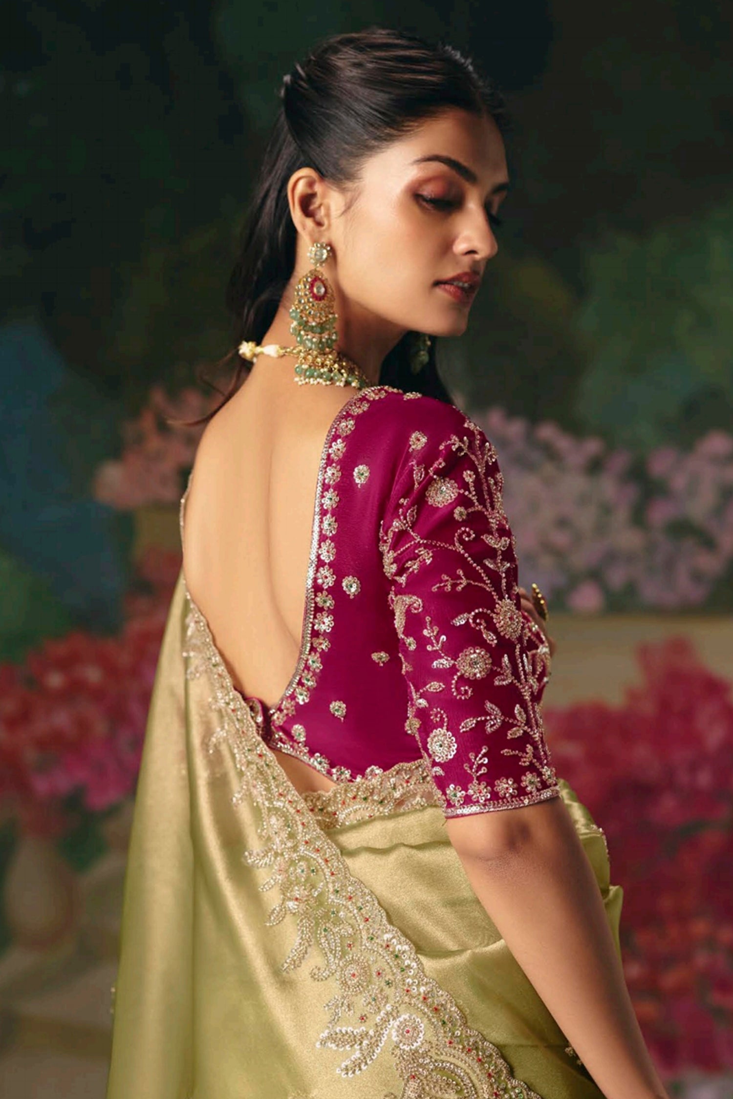 Embodied in a refreshing olive-green tone, this sophisticated saree is crafted from premium, lightweight Organza fabric. The saree is defined by an exquisite scalloped border that is intricately detailed with gold-toned embroidery, shimmering sequins, and fine cutdana work. Delicate floral bootis are scattered across the body of the saree, providing a refined and subtle sparkle. It is paired with a contrasting magenta blouse that features heavy floral embroidery and sequin work on the sleeves and neckline, creating a vibrant and regal appearance. This ensemble is a premier choice for weddings, high-end festive gatherings, and evening ceremonies.