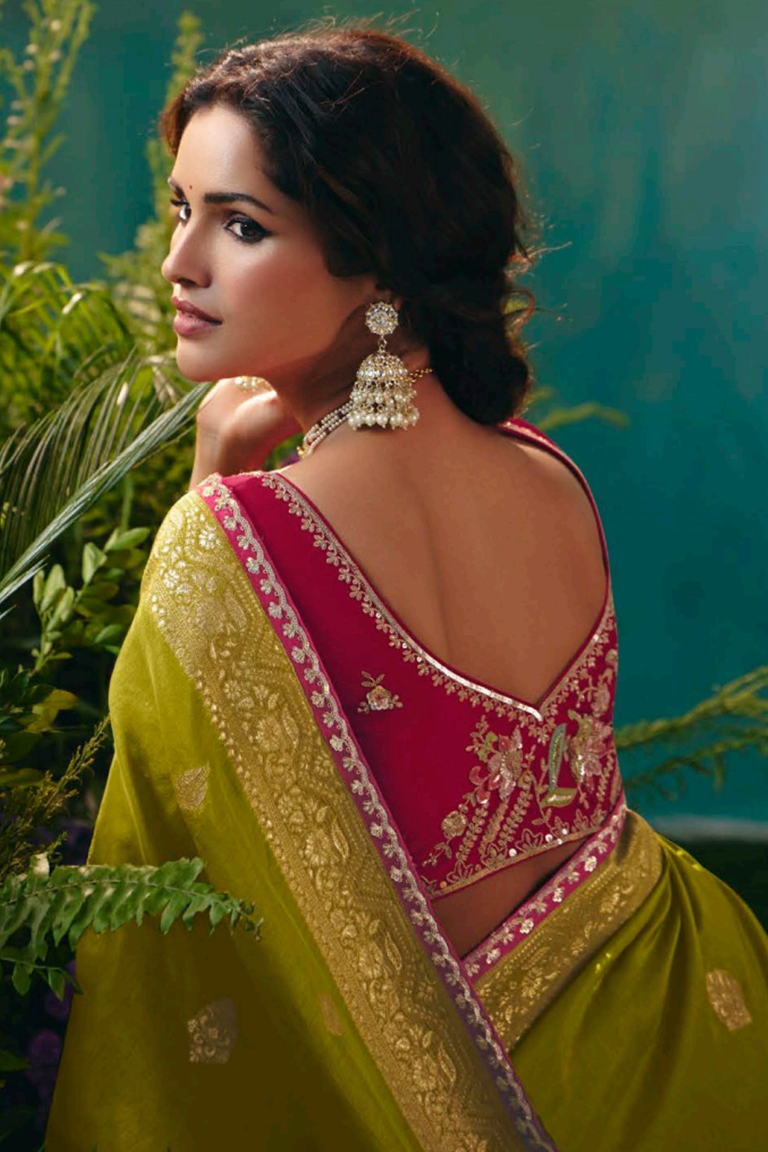 Discover refined elegance with this Olive Green Silk Viscose Saree, beautifully enhanced with intricate weaving details.