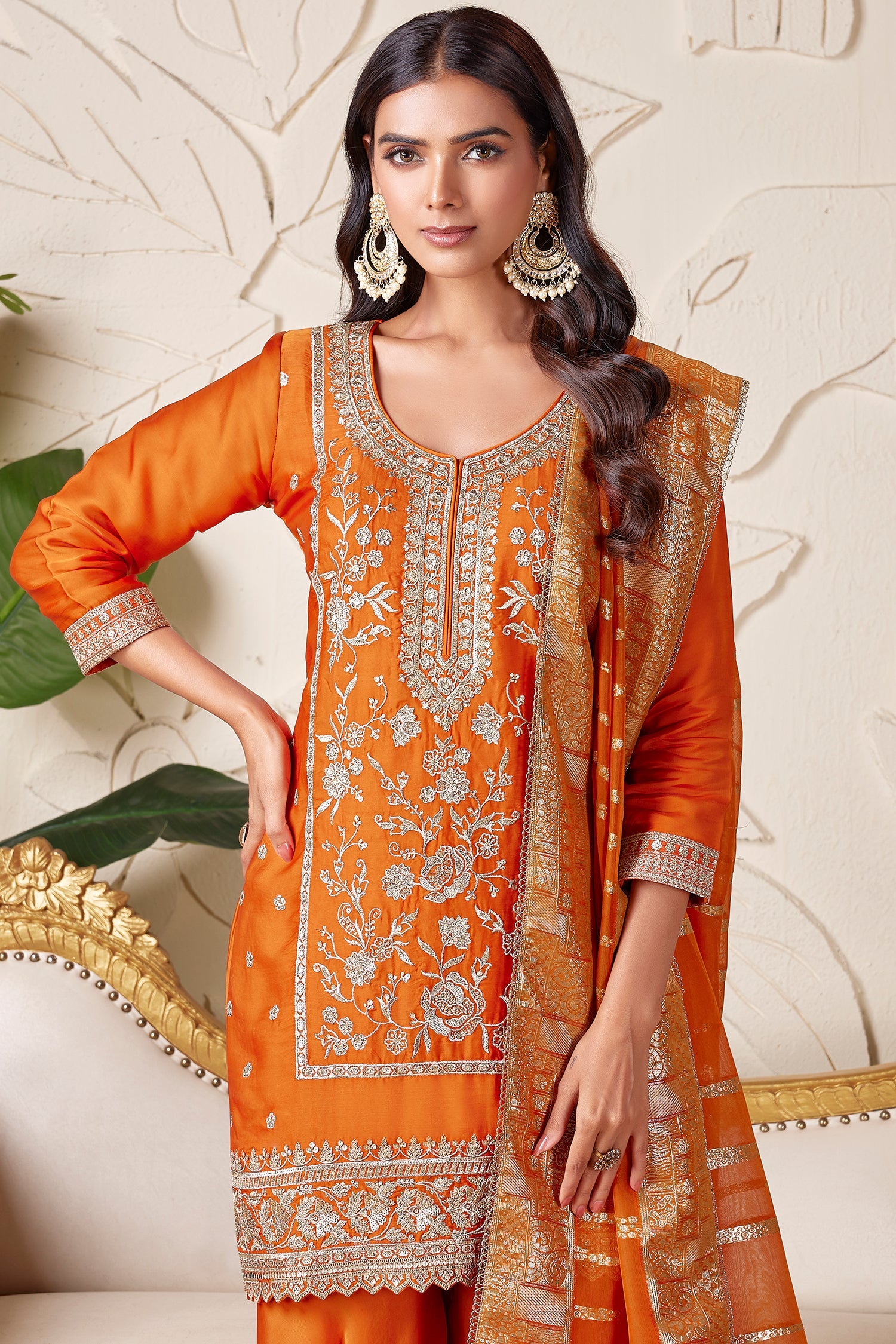 Radiant in orange, this satin organza sharara suit captures festive vibrance with a touch of elegance. The kurta features intricate sequin embroidery along the neckline and borders, adding a subtle shimmer to the rich fabric. Completed with a flowing sharara, the ensemble blends graceful movement with refined detailing, making it a perfect pick for festive celebrations and special occasions.
