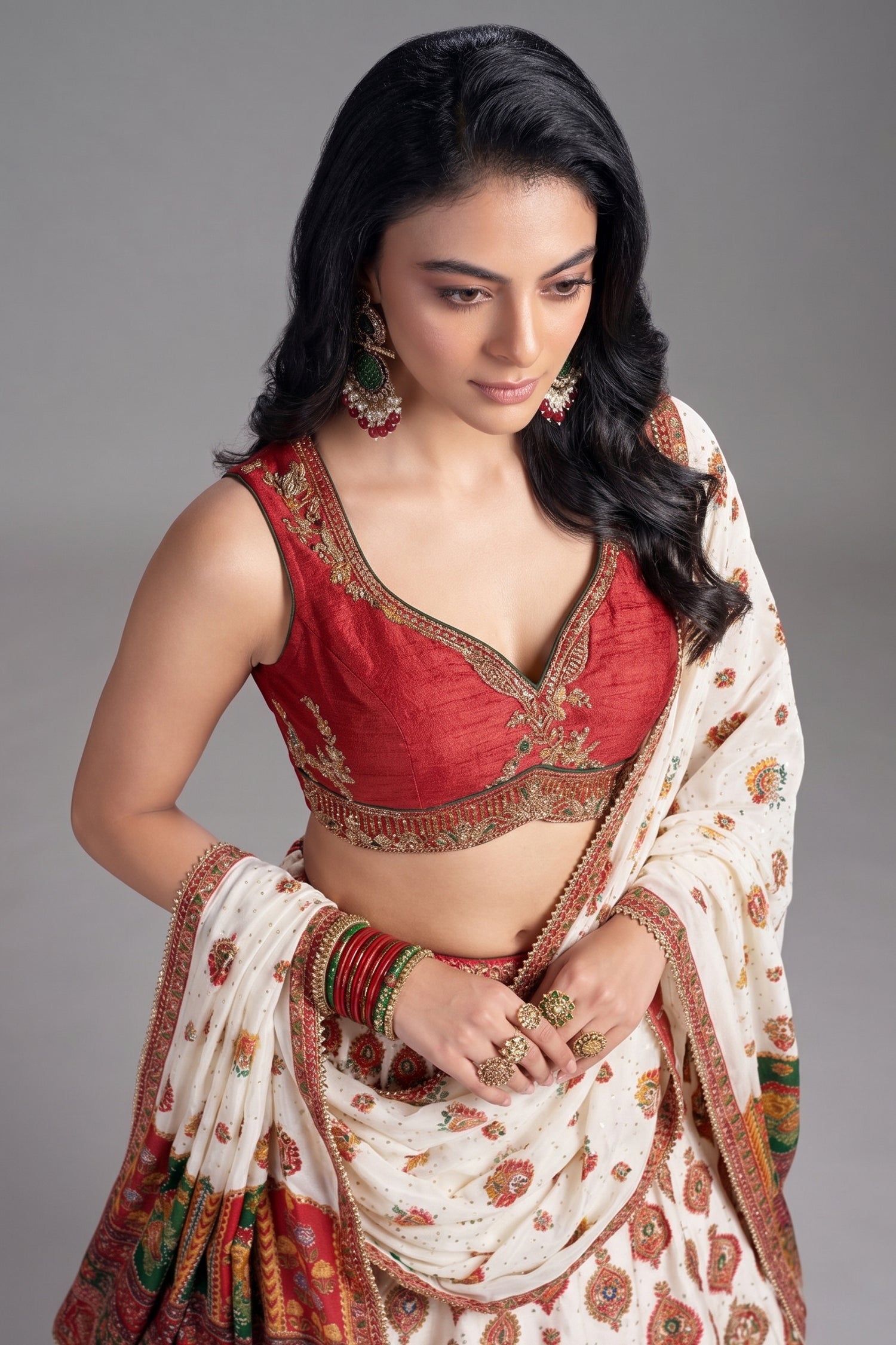 Experience the charm of traditional aesthetics with this Pearl White Chiffon Silk Lehenga , featuring a stunning all-over digital print. The design is meticulously crafted with ornate floral butti motifs in the upper half, transitioning into a magnificent multi-colored paneled border at the hem that showcases intricate garden-inspired patterns. The fluid nature of the chiffon silk ensures an effortless, airy drape with every step you take.The ensemble is paired with a striking contrasting Red blouse, designed in a sleeveless crop-top style with a plunging V-neckline. The blouse is a masterpiece of artisanal detail, exquisitely hand-adorned with shimmering sequins, metallic beads, and fine embroidery that highlights the vibrant tones of the lehenga. A coordinated printed dupatta with a delicate border and matching tassels completes this high-fashion ethnic silhouette. Perfectly suited for sangeet ceremonies, festive gatherings, or garden weddings, this lehenga is a definitive statement of graceful luxury.