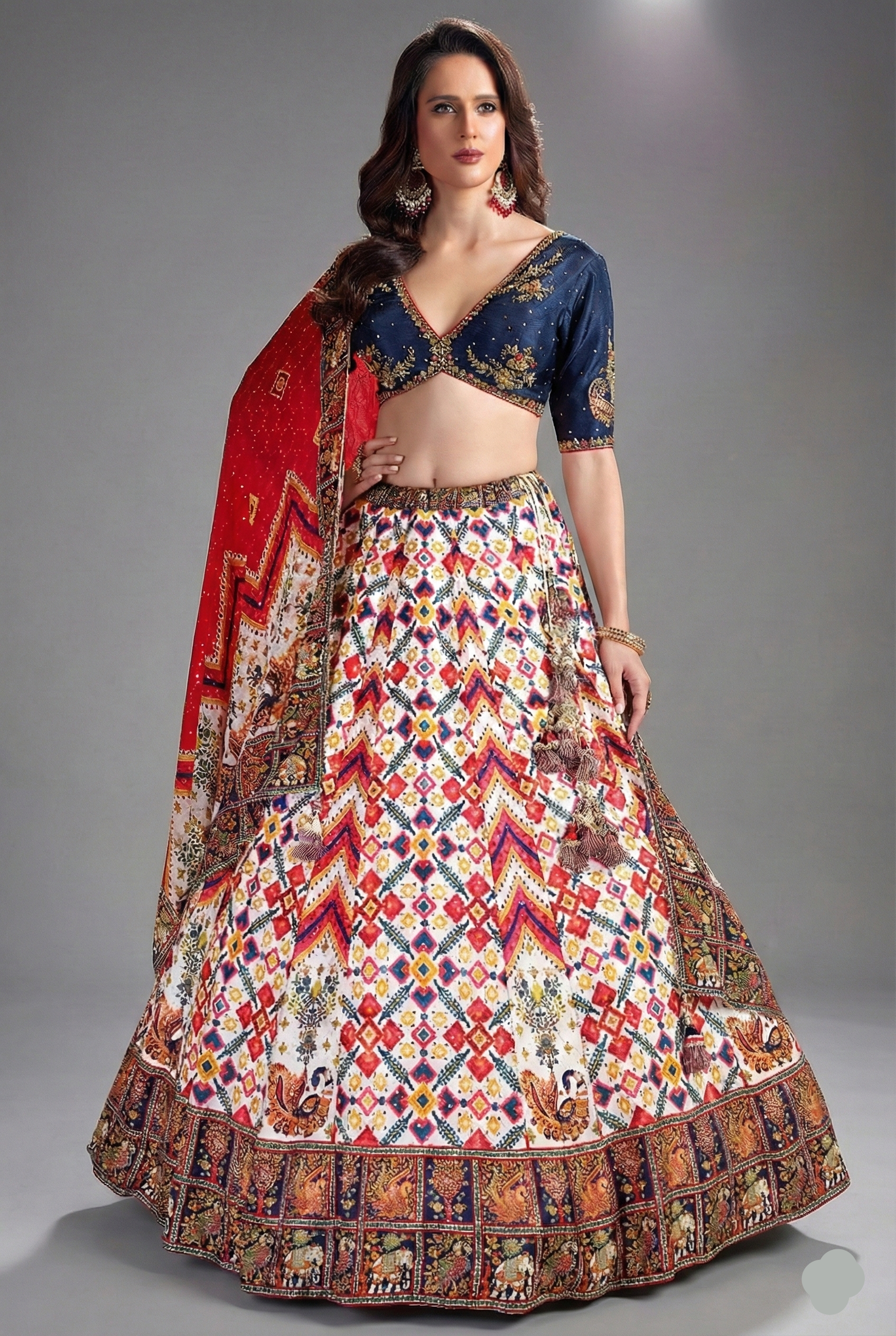 Experience the charm of traditional aesthetics with this Pearl White Chiffon Silk Lehenga , featuring a stunning all-over digital print. The design is meticulously crafted with ornate geometric and floral motifs in a kaleidoscope of red, yellow, and blue, transitioning into a magnificent paneled border at the hem that showcases intricate peacock and elephant patterns. The fluid nature of the chiffon silk, subtly highlighted with shimmering sequin work, ensures an effortless, airy drape with a touch of sparkle in every movement.The ensemble is paired with a striking contrasting Navy Blue blouse, designed in a modern V-neck style with elegant half-sleeves. The blouse is a masterpiece of artisanal detail, exquisitely hand-adorned with shimmering golden Zardosi, sequins, and fine embroidery that highlights the ornate floral motifs on the sleeves and neckline. A coordinated vibrant red dupatta with a delicate border and matching tassels completes this high-fashion ethnic silhouette. Perfectly suited for sangeet ceremonies, festive gatherings, or garden weddings, this lehenga is a definitive statement of graceful luxury.