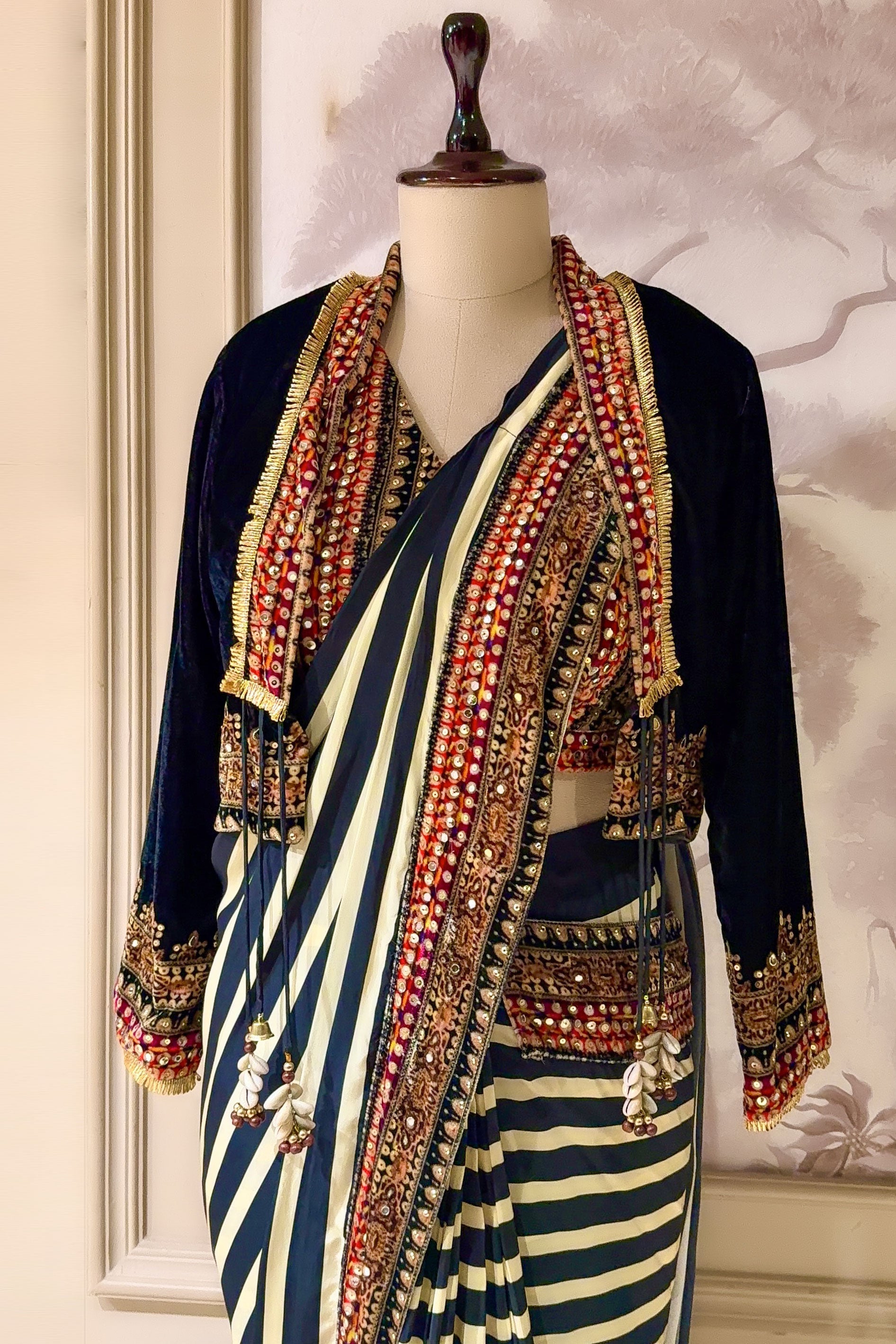 Since the velvet jacket and Sequins work are quite detailed, style this outfit with sleek pulled-back hair and statement studs. Add a silver clutch to match the mirror work and high heels to enhance the graceful fall of the stripes.