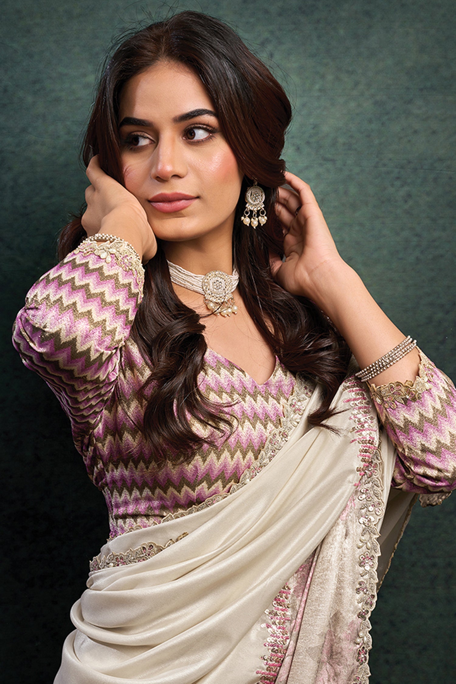 Exuding a pristine and ethereal charm, this pearl white saree is masterfully crafted from premium Uppada Silk, known for its sheer texture and weightless feel. The minimalist plain body allows the natural luster of the silk to shine, while the borders are delicately detailed with intricate lace work, shimmering sequins, and floral embroidery for a touch of modern glam. A defining highlight is the accompanying multi-colored brocade silk blouse, featuring a rich, contrasting pattern that transforms the ensemble into a high-fashion statement. This saree offers a sophisticated and graceful look, perfect for intimate weddings, morning ceremonies, and elegant festive gatherings.