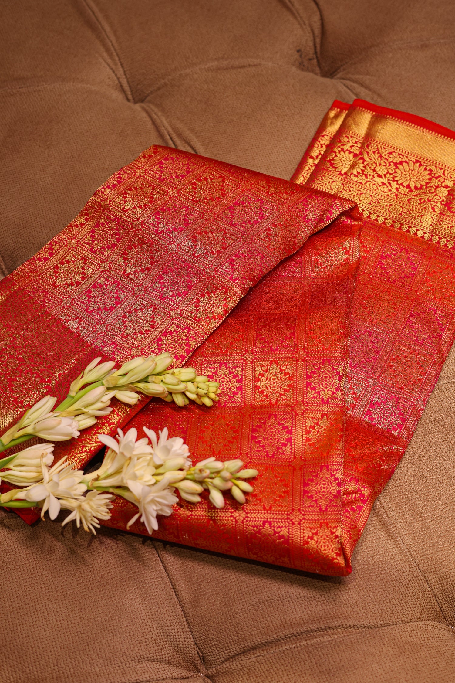 Step into timeless elegance with this exquisite dual-toned Kanchipuram silk saree, blending rich shades of red and pink for a striking, regal appeal. The traditional checks weave adds a classic charm, highlighting the finesse of authentic South Indian craftsmanship. Its lustrous silk drape enhances every movement, making it perfect for weddings, festive ceremonies, and special celebrations. A heritage masterpiece that beautifully unites vibrant color play, tradition, and luxury.