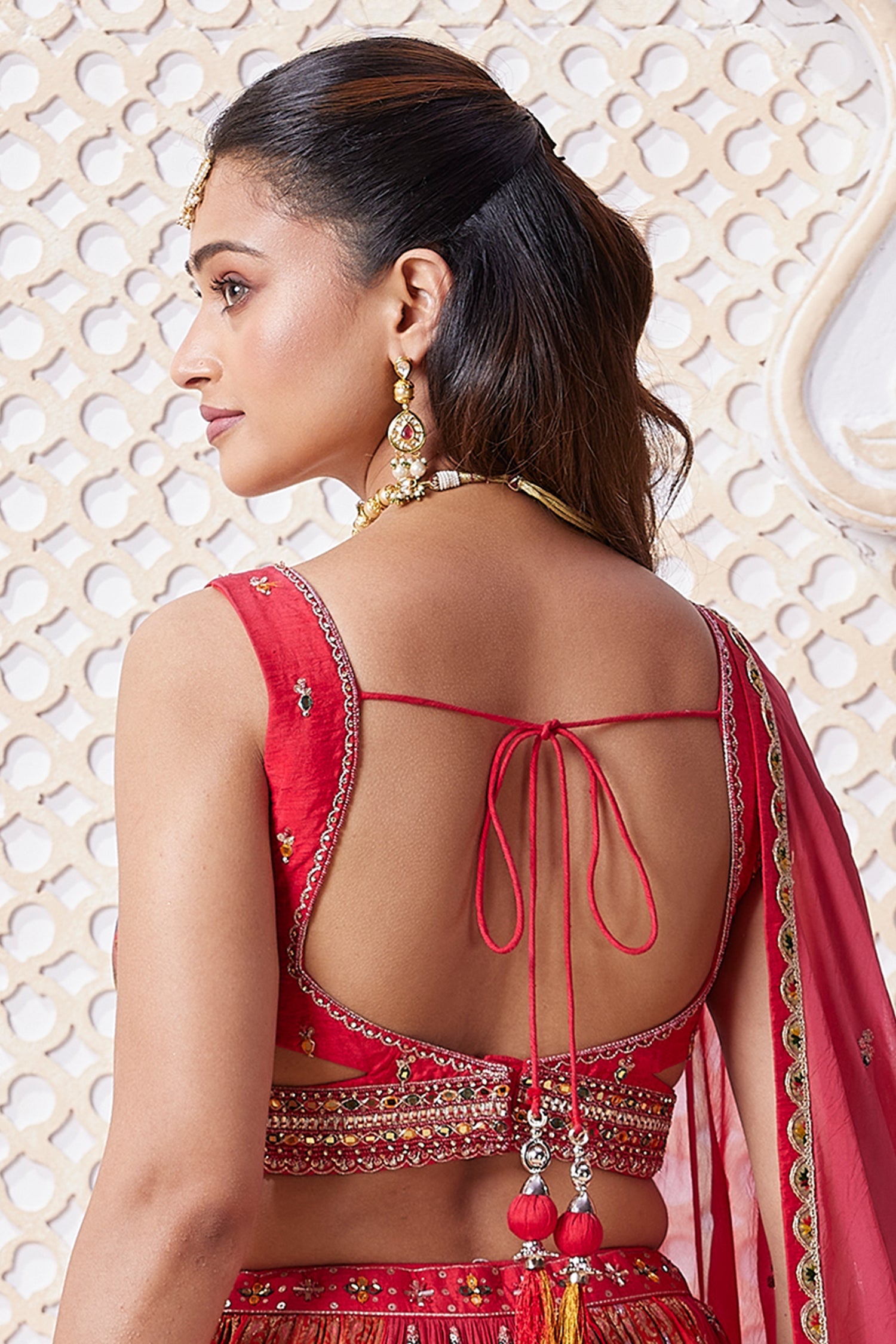 This vibrant pink Chinon lehenga features exquisite woven patterns paired with intricate sequin and thread embellishments that elevate its traditional charm. The pleated skirt showcases detailed motifs and palace-inspired artwork, adding richness and movement to the silhouette. The beautifully crafted blouse highlights fine beadwork and a stylish back-tie design for a contemporary touch. Paired with a coordinated dupatta featuring subtle embroidery, this ensemble is perfect for weddings, sangeet nights, and grand festive celebrations.