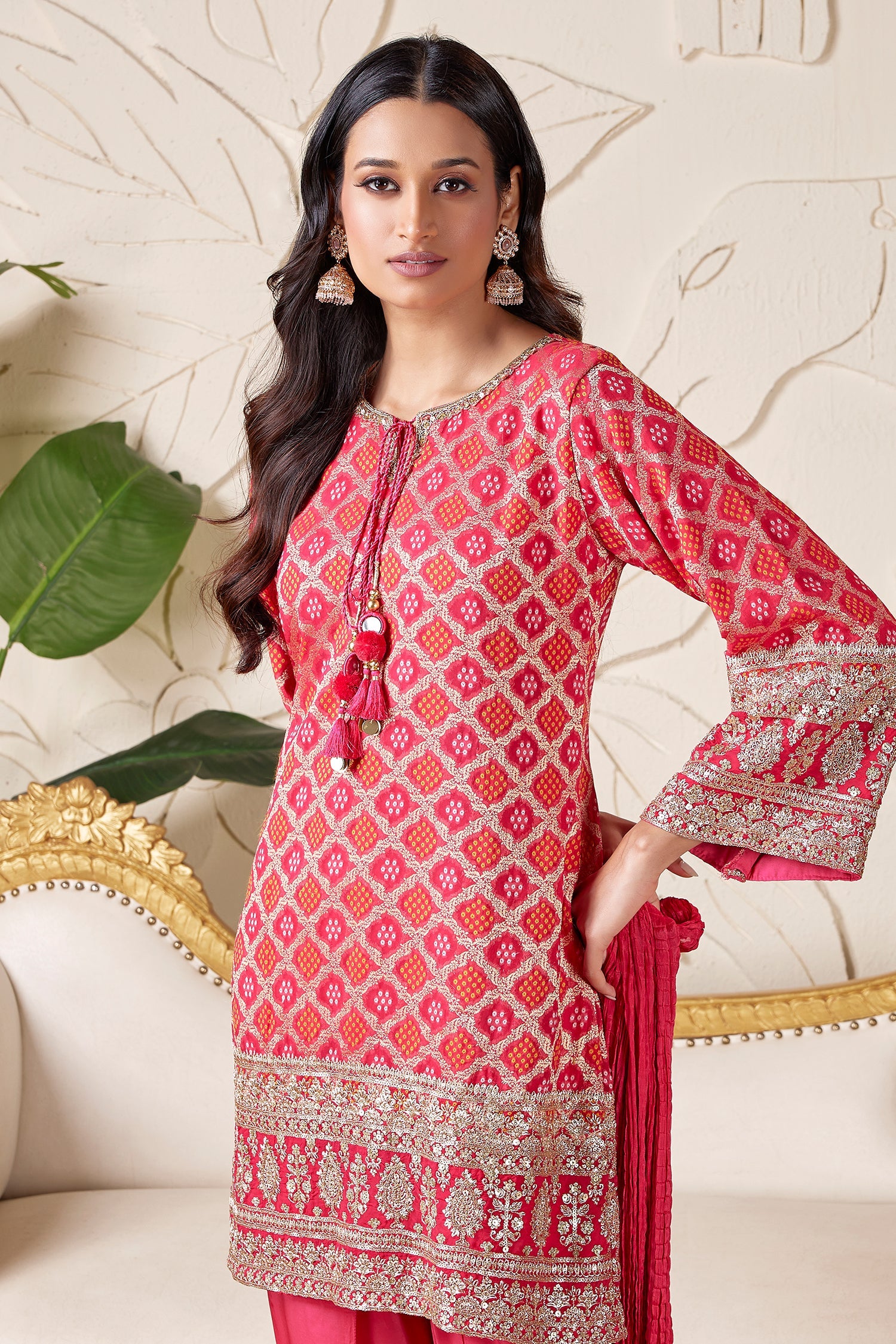 A vibrant pink georgette bandhej dhoti suit that celebrates traditional charm with contemporary style. The kurta features classic checkered bandhej weaving, highlighted with sequin and zardosi embroidery along the borders for a subtle festive shimmer. Paired with tulip-style dhoti pants, the ensemble combines graceful movement with artisanal detailing, making it perfect for festive occasions and celebratory gatherings.