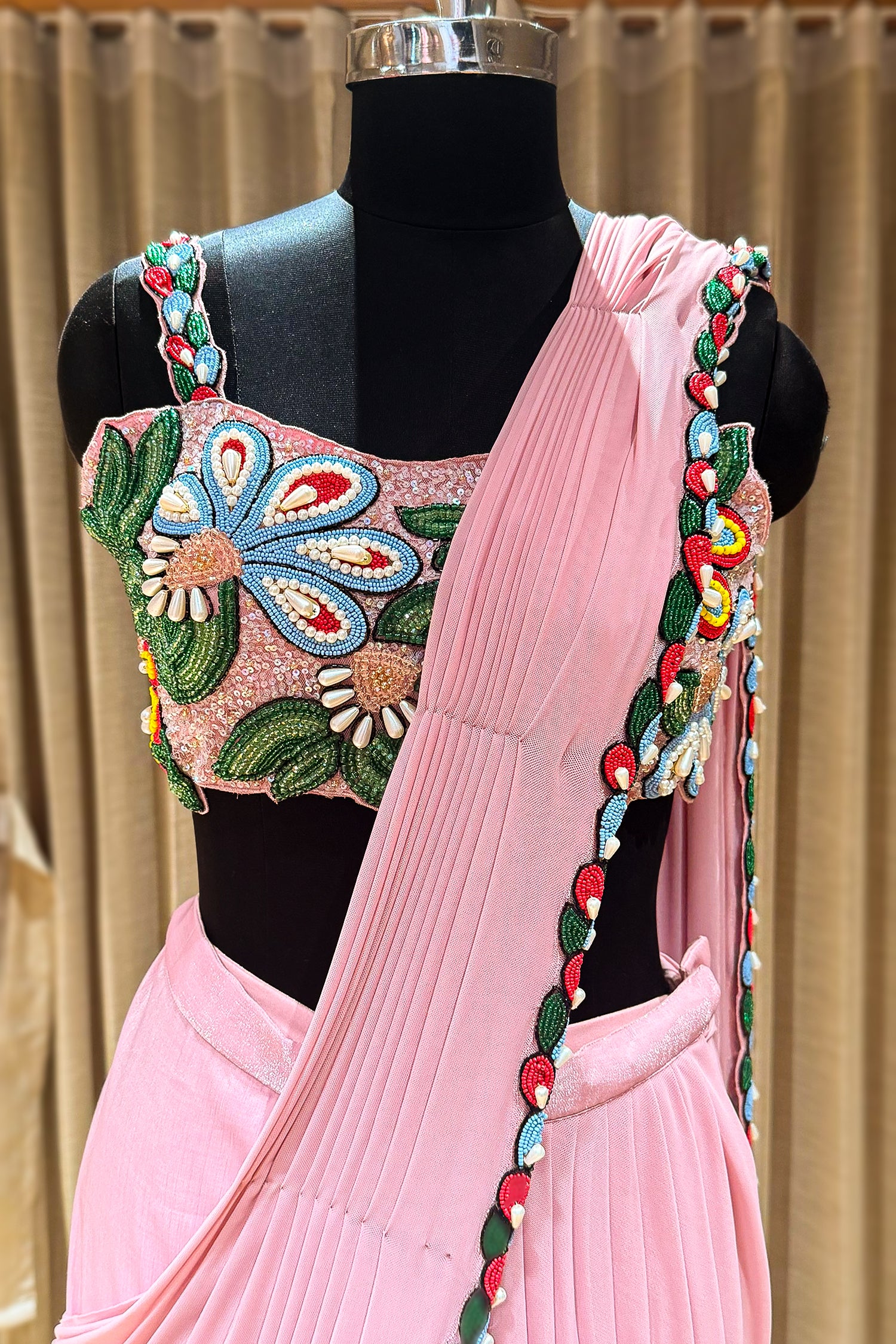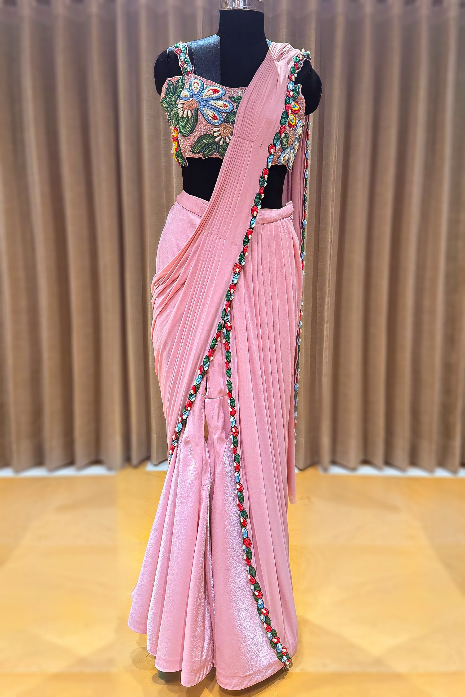 This Pink Lycra Net Readymade Saree offers a chic and feminine silhouette with its soft, stretchable drape. The lightweight lycra net enhances elegance while ensuring effortless comfort. Detailed with delicate beaded and cutdana work, the saree adds a beautiful touch of sparkle and refinement. Easy to wear and stylishly modern, it’s perfect for parties, receptions, and festive celebrations.