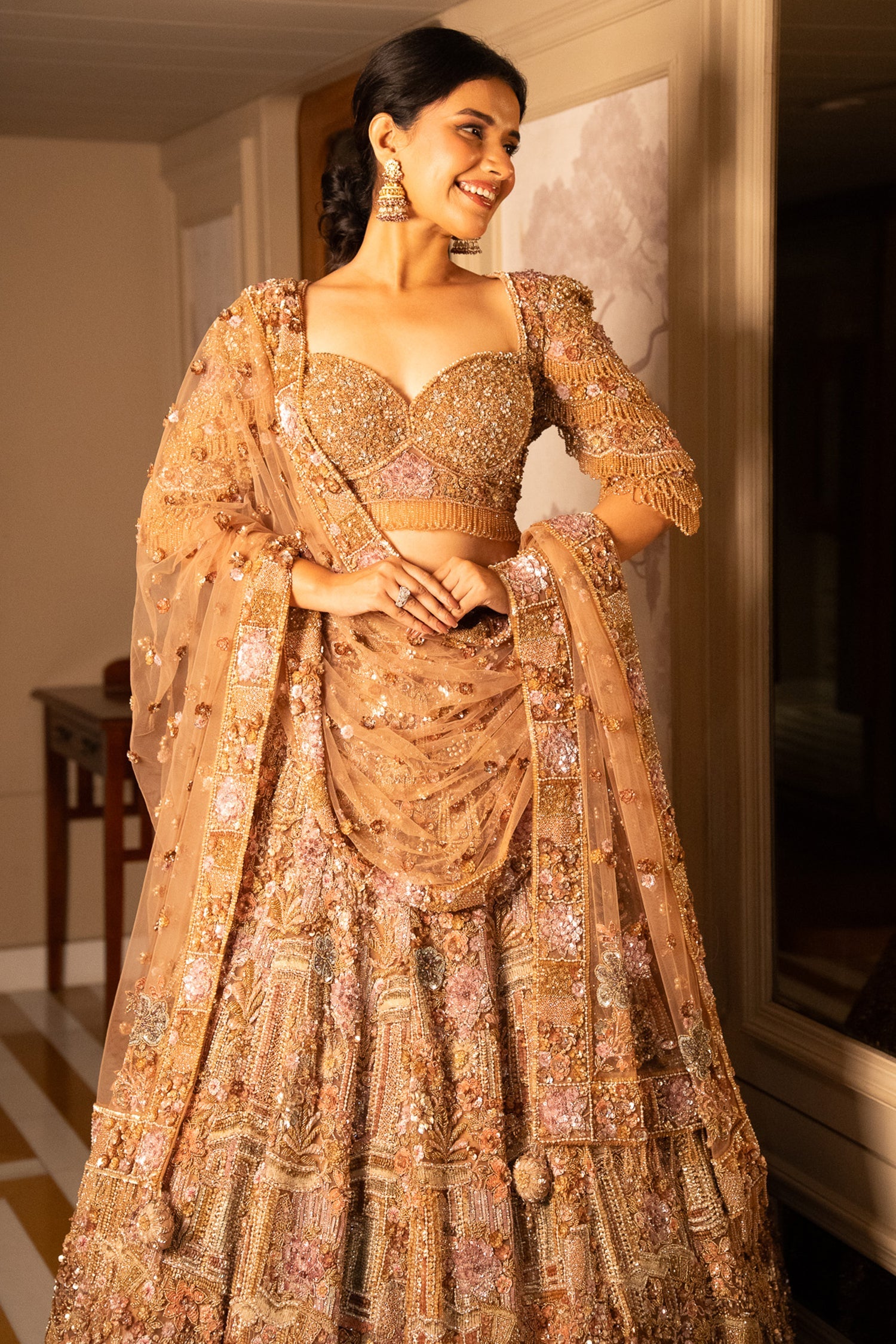 This exquisite pink net designer lehenga is a celebration of refined craftsmanship and timeless elegance. The sculpted blouse features a graceful sweetheart neckline, adorned with intricate sequin, cutdana, and hand-beaded detailing for a radiant, couture finish. Delicately embellished half sleeves add depth and sophistication to the silhouette.The voluminous lehenga skirt is richly embroidered with shimmering motifs that create effortless movement and grandeur. Paired with a sheer net dupatta finished with ornate embroidered borders, this ensemble is designed for grand bridal moments and elegant celebrations.