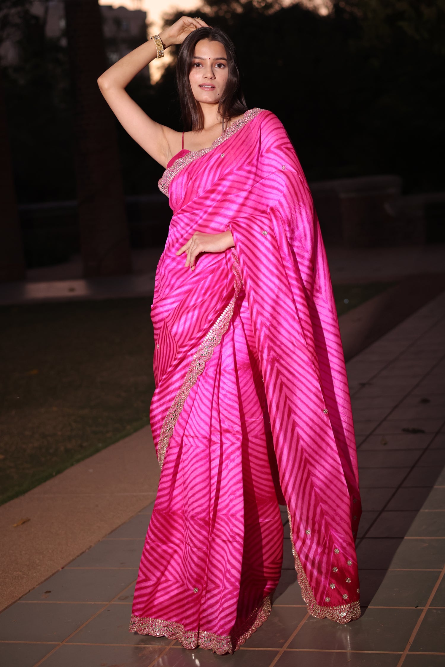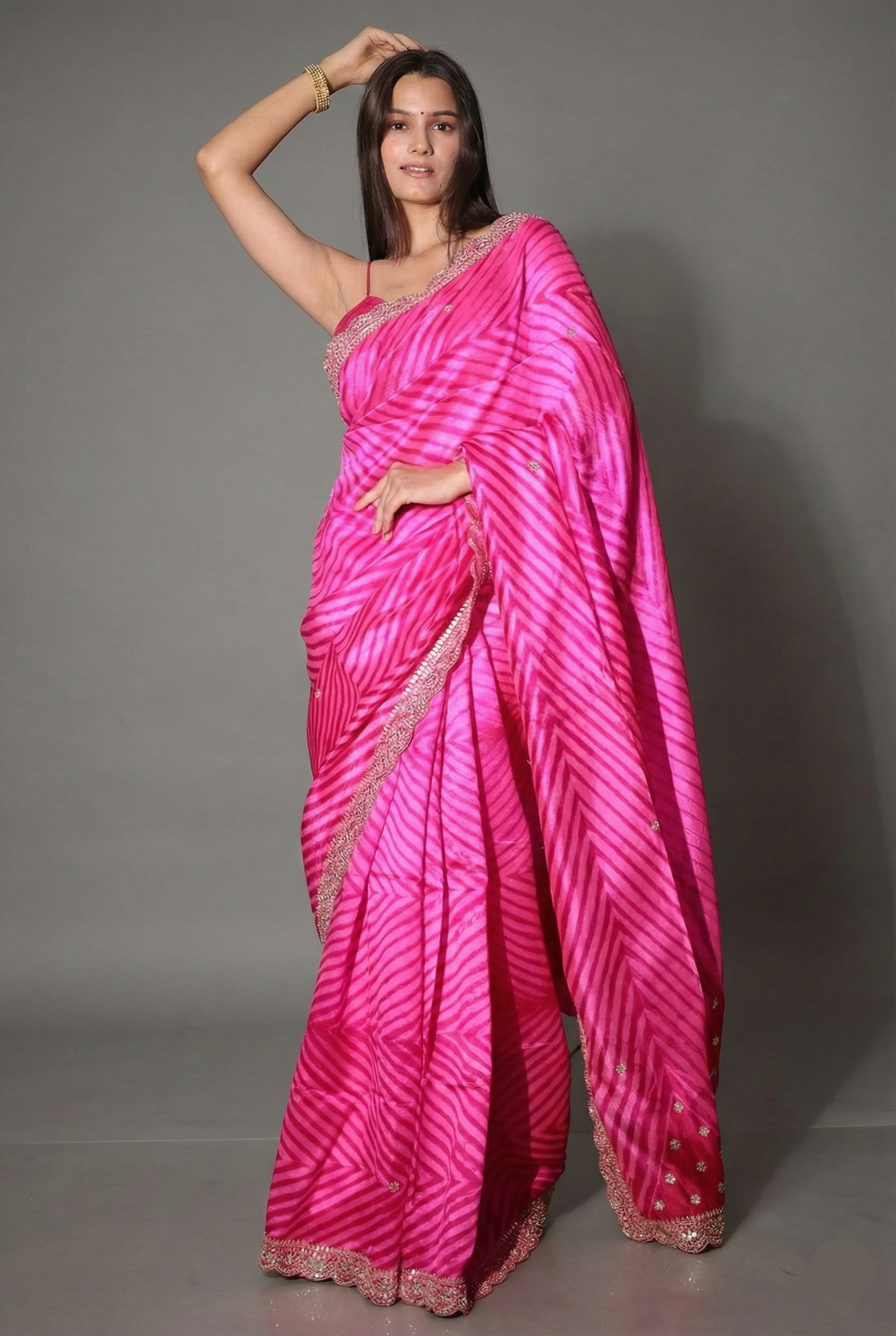 Make a bold, vibrant statement in this Pink Silk Leheriya Printed Saree. Featuring the iconic Rajasthani diagonal stripe pattern in a stunning shade of Hot Pink (Rani Pink), this saree is designed for the woman who loves to stand out. The traditional print gets a high-fashion update with a handcrafted Applique Scallop Border, embellished with sequins and thread work that adds a delicate, feminine frame to the drape. Lightweight yet luxurious, the silk fabric flows effortlessly, making it the perfect choice for Sangeet nights, festive parties, or any celebration where you want to channel your inner "Desi Barbie." Complete with an unstitched blouse piece.